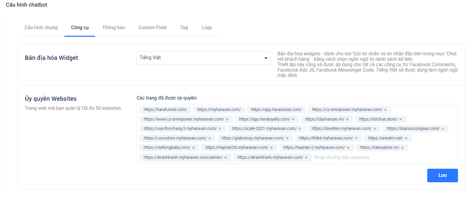 Lưu ý: Facebook quy định giới hạn về số lượt hành động thêm tên miền là 10 lần cập nhật trong 1 phút, nếu thực hiện quá nhiều hành động sẽ dẫn đến một số lỗi không mong muốn. Hiện tại, với Harasocial bạn có thể thực hiện thao tác thêm hàng loạt danh sách tên miền trong 1 lần và nhấn nút “Lưu”, điều này làm tránh vượt giới hạn hành động yêu cầu từ Facebook.