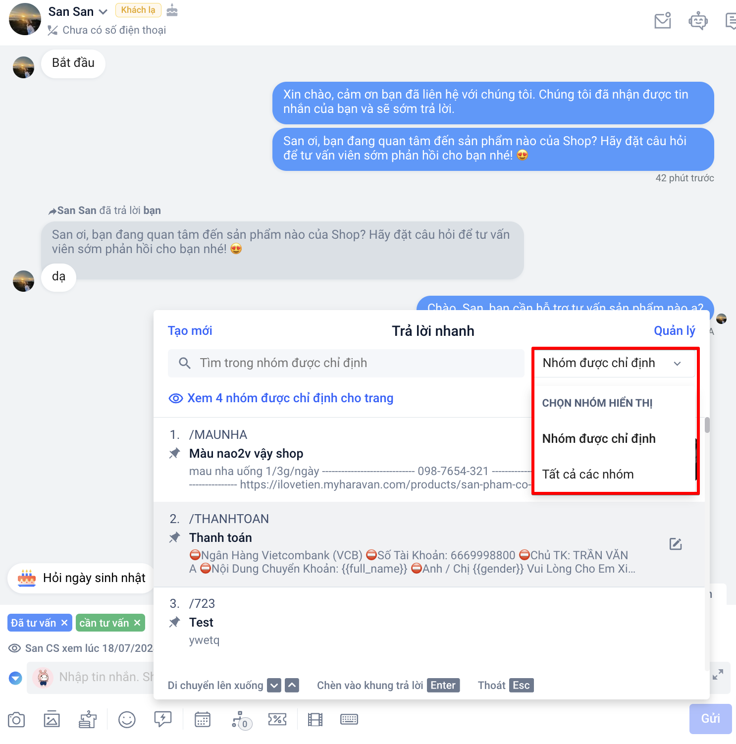 - **Nhóm được chỉ định:**Hệ thống sẽ tự động ghi nhận với trang bạn đang truy cập để chat với khách hàng và hiển thị các câu trả lời nhanh tương ứng với trang đó.