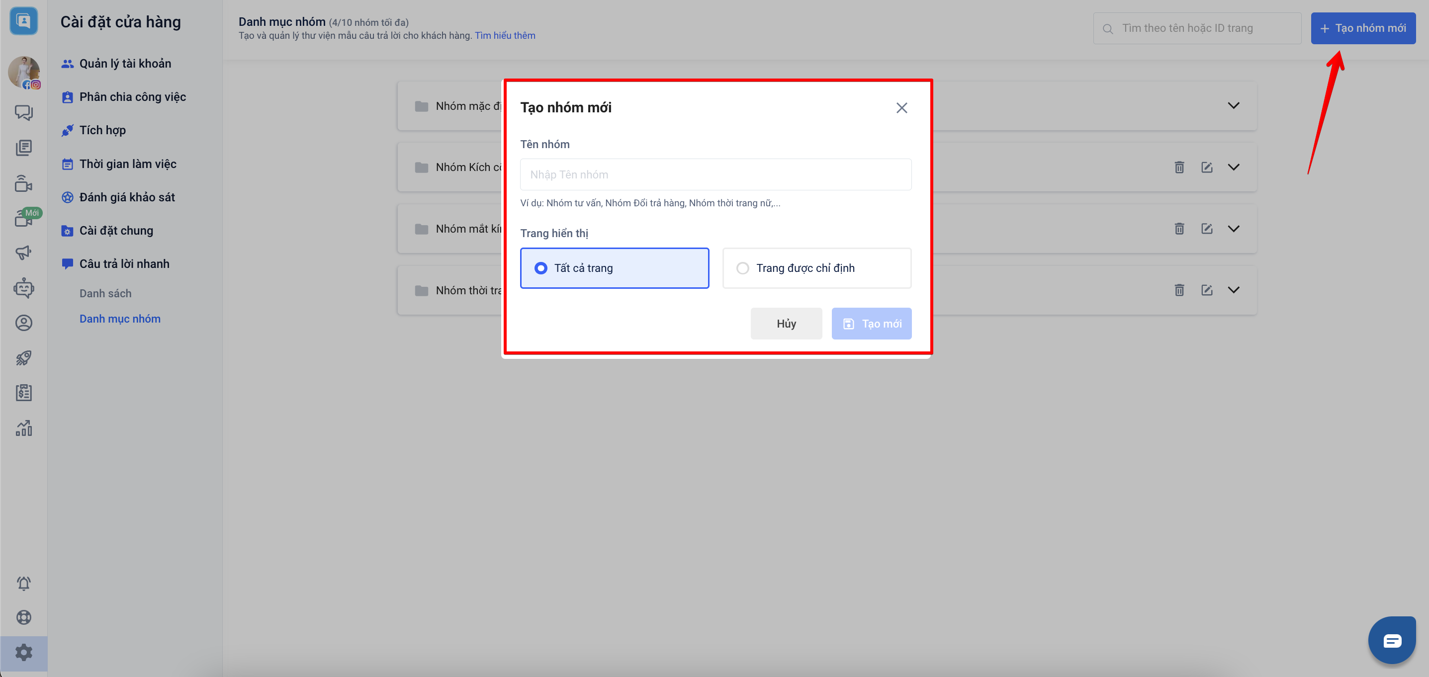 - Tất cả trang: Câu trả lời nhanh khi bạn tạo sẽ được áp dụng tất cả các trang có trong tài khoản.