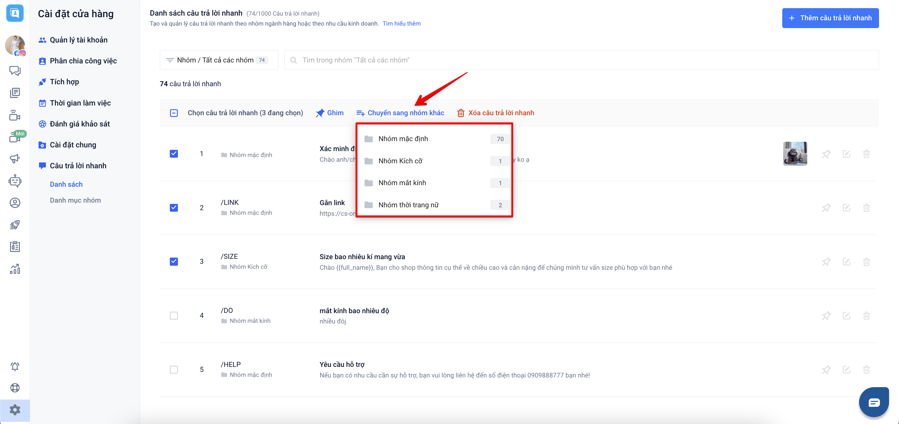 Để có thể chuyển các câu trả lời nhanh vào nhóm tương ứng, bạn thao tác như sau: