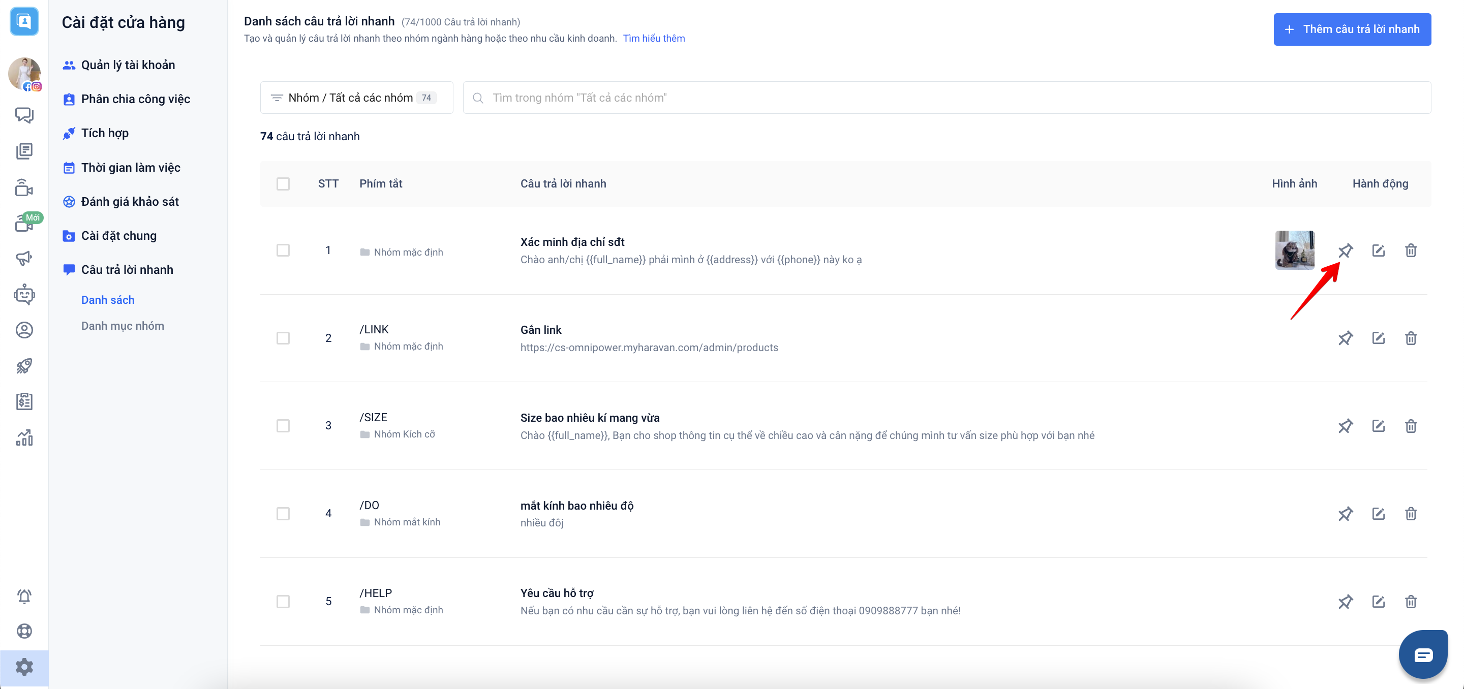 Trong trường hợp có các câu trả lời nhanh thông dụng, được sử dụng nhiều nhất, bạn có thể thực hiện ghim các câu trả lời nhanh lên đầu danh sách bằng cách nhấn vào ký hiệu như sau: