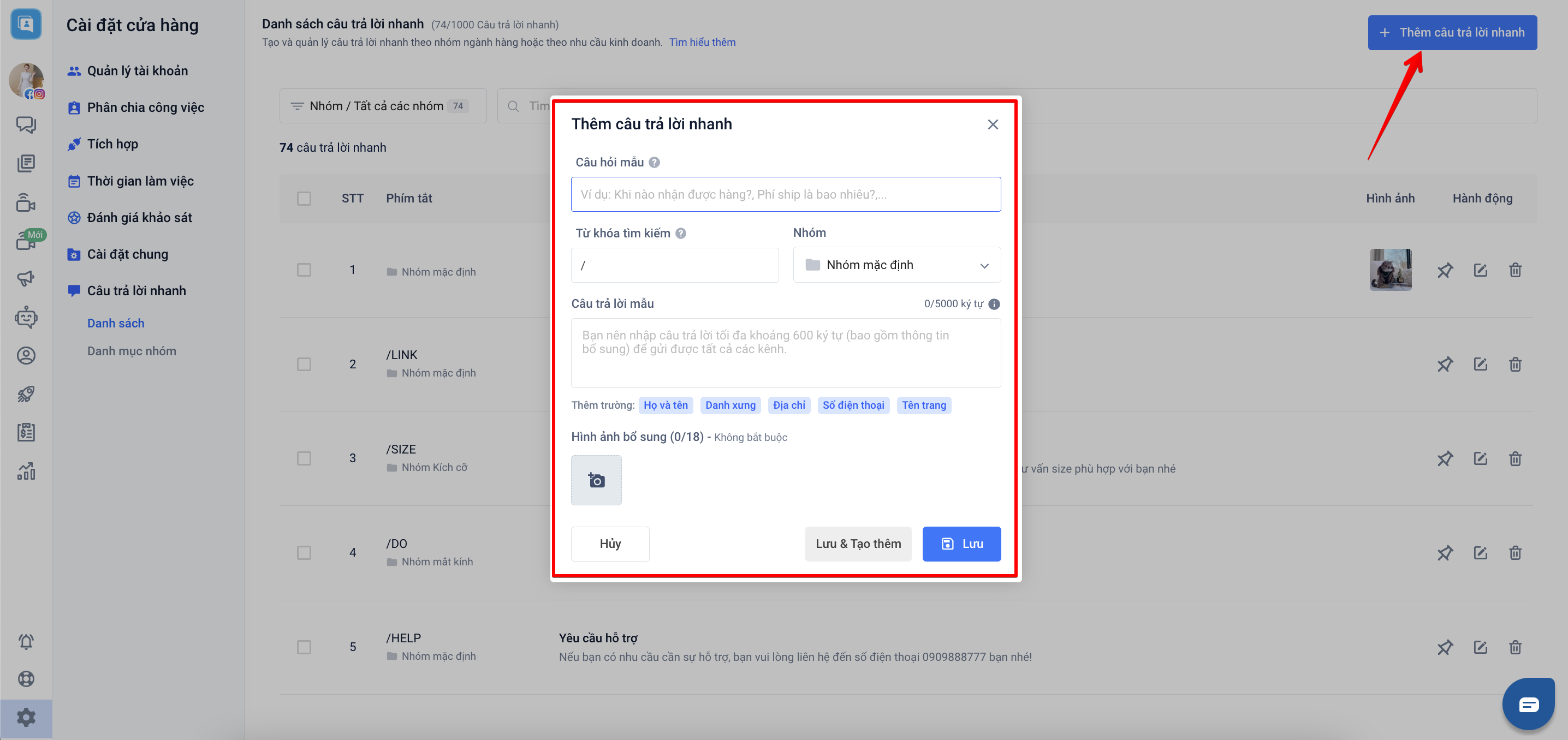 Tại đây bạn có thể thực hiện thao tác tạo câu trả lời nhanh bằng cách nhấp vào “+Thêm câu trả lời nhanh” và nhập các thông tin cần thiết: