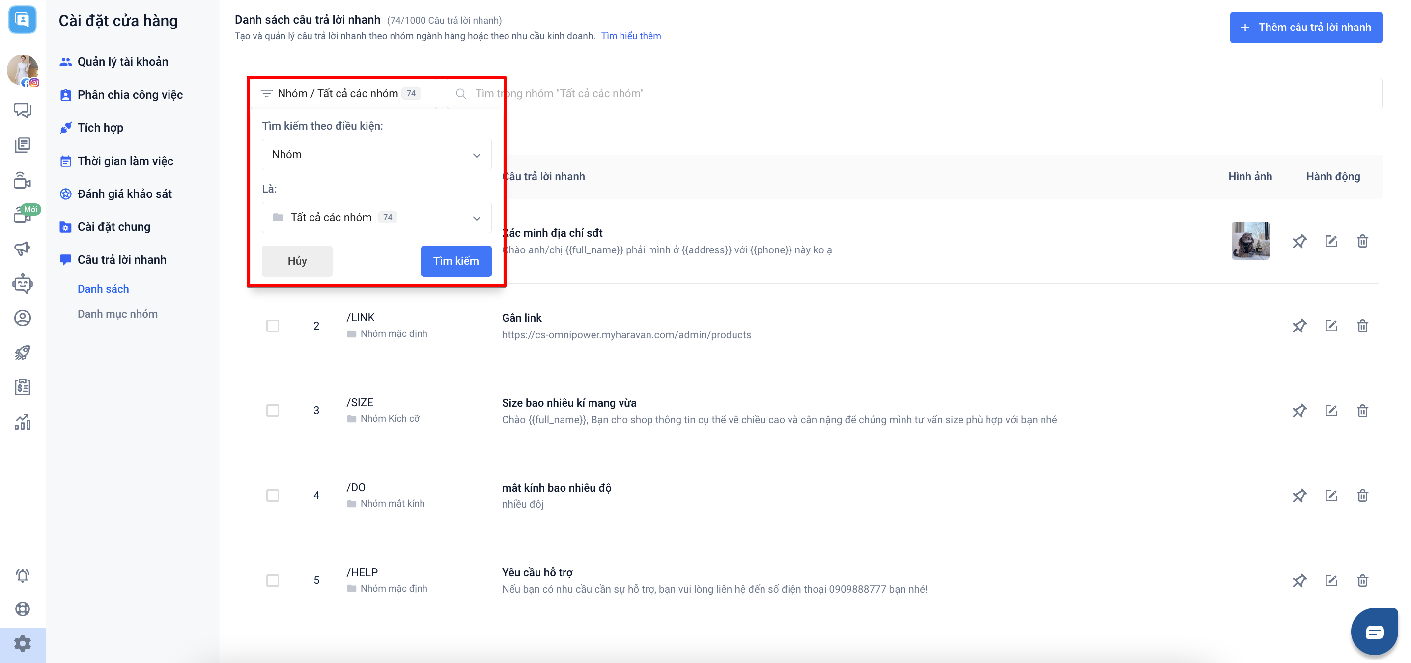 Tại đây sẽ có 2 phần bao gồm: Danh sách các câu trả lời nhanh & Danh mục nhóm: