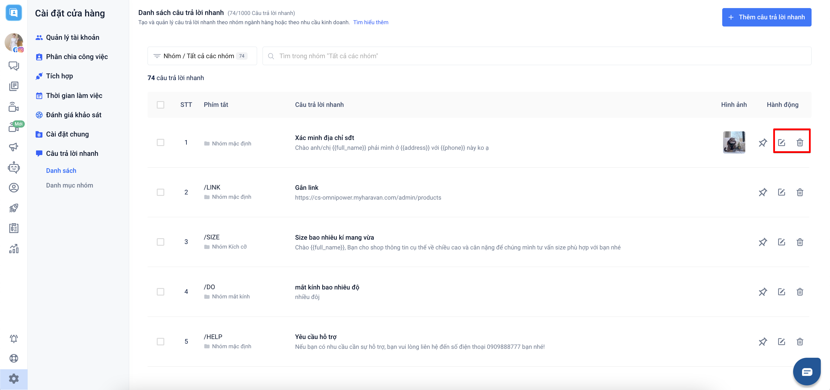 - Harasocial sẽ giới hạn số lượng câu trả lời nhanh phụ thuộc vào gói dịch vụ mà bạn đang sử dụng. Trong trường hợp vượt quá giới hạn câu trả lời nhanh, bạn vui lòng thực hiện nâng cấp gói hoặc xóa đi những câu không cần thiết.