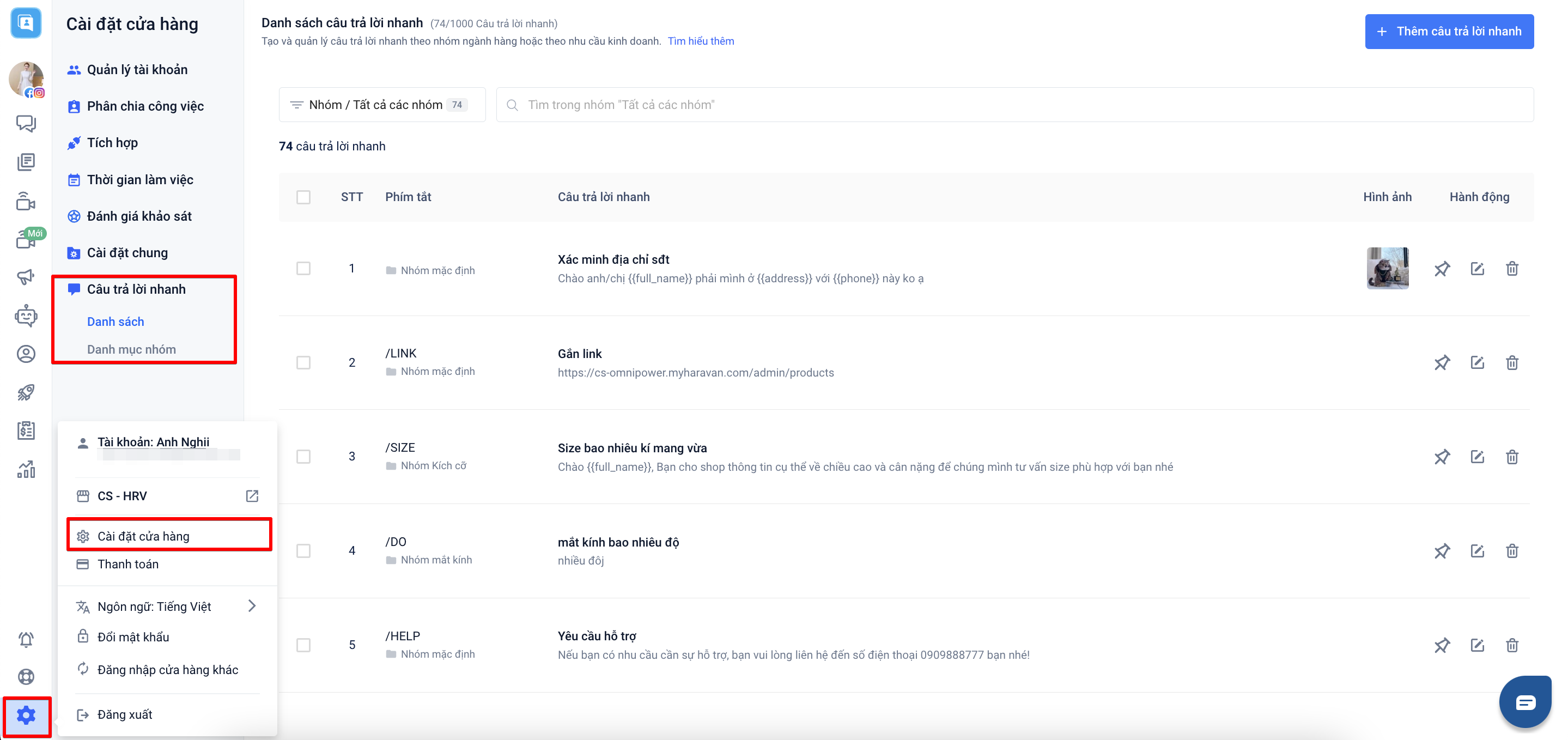 Để truy cập vào danh sách quản lý câu trả lời nhanh, bạn chọn Tài khoản → Cài đặt cửa hàng → Câu trả lời nhanh: