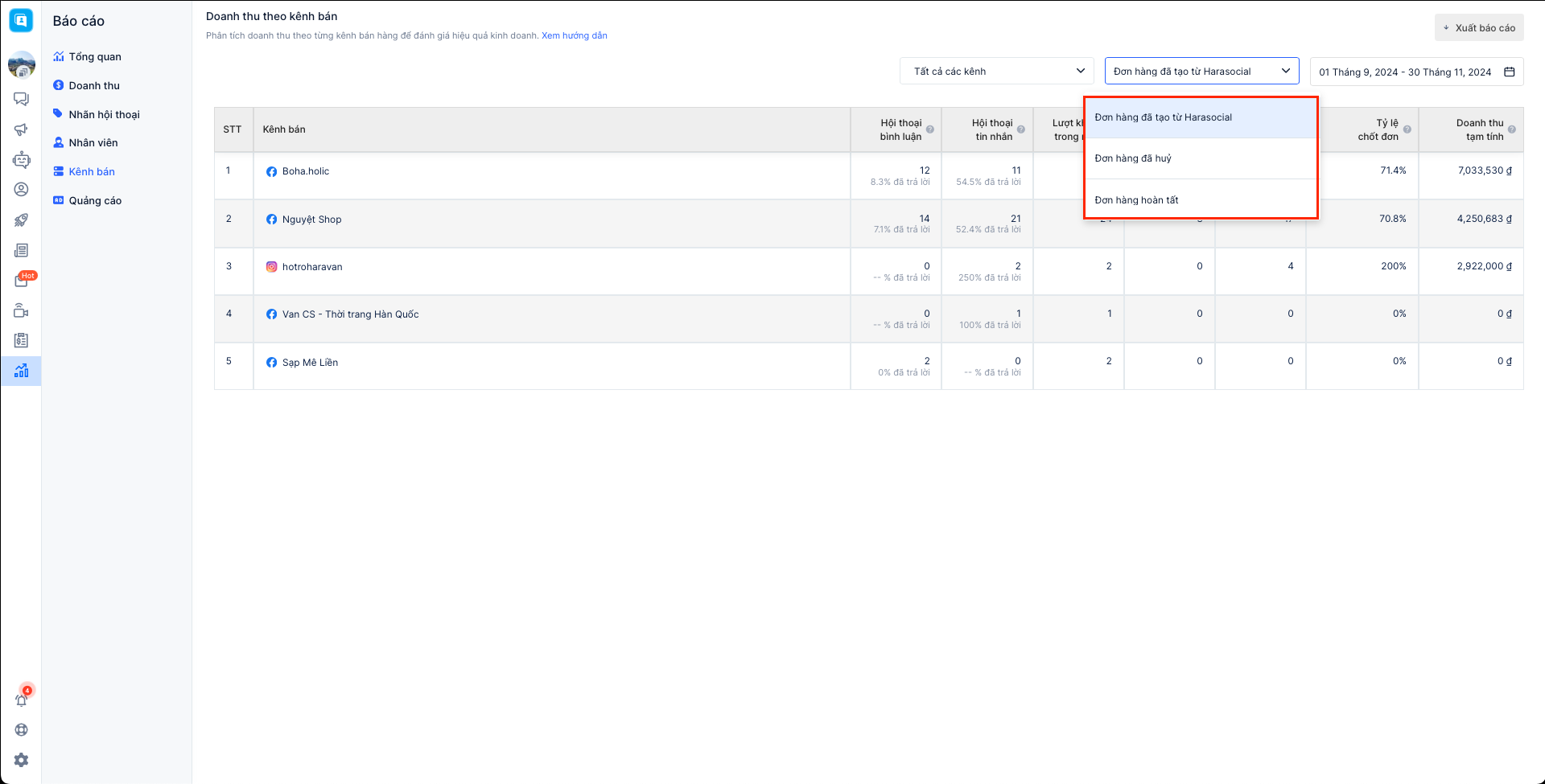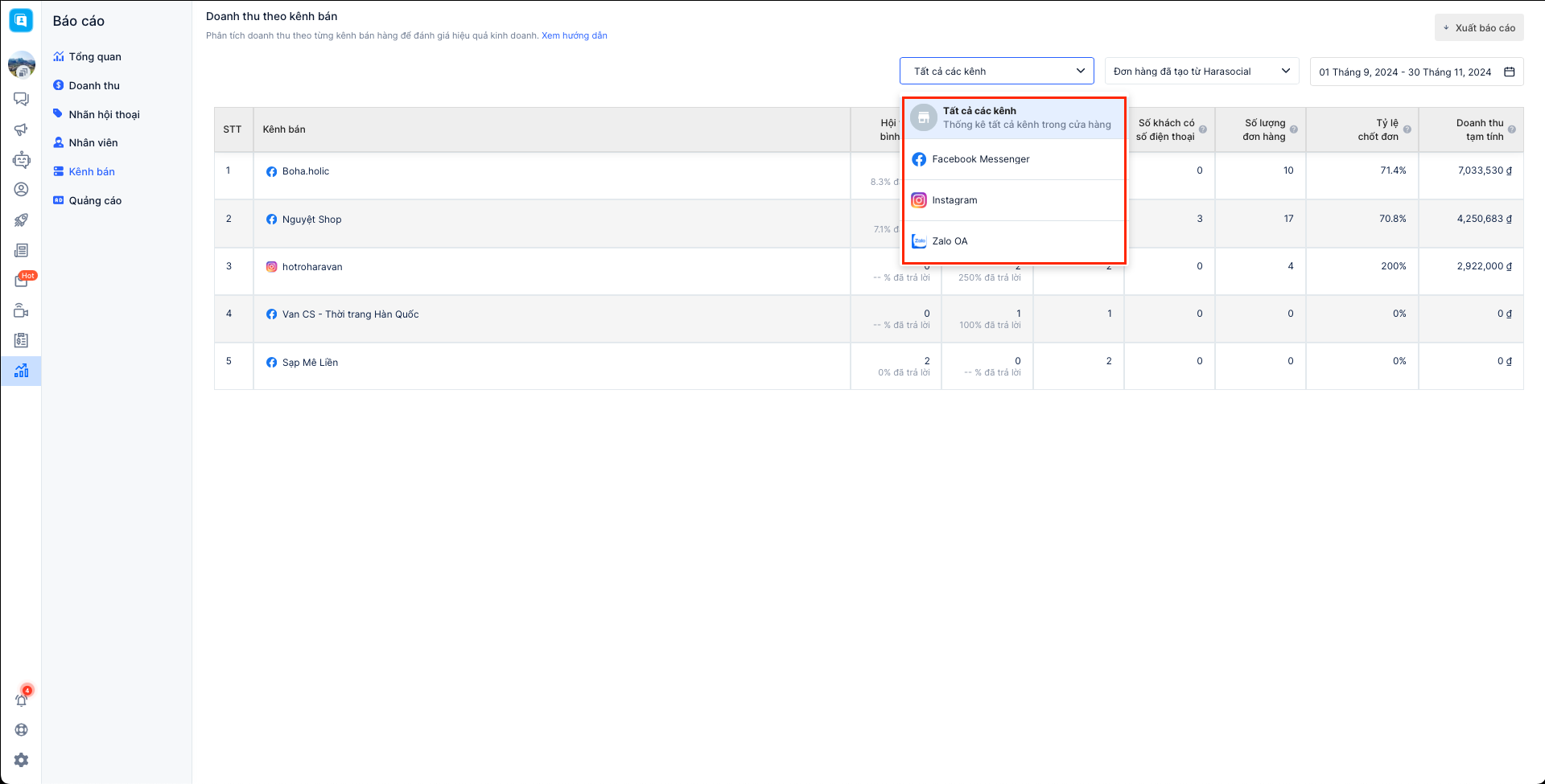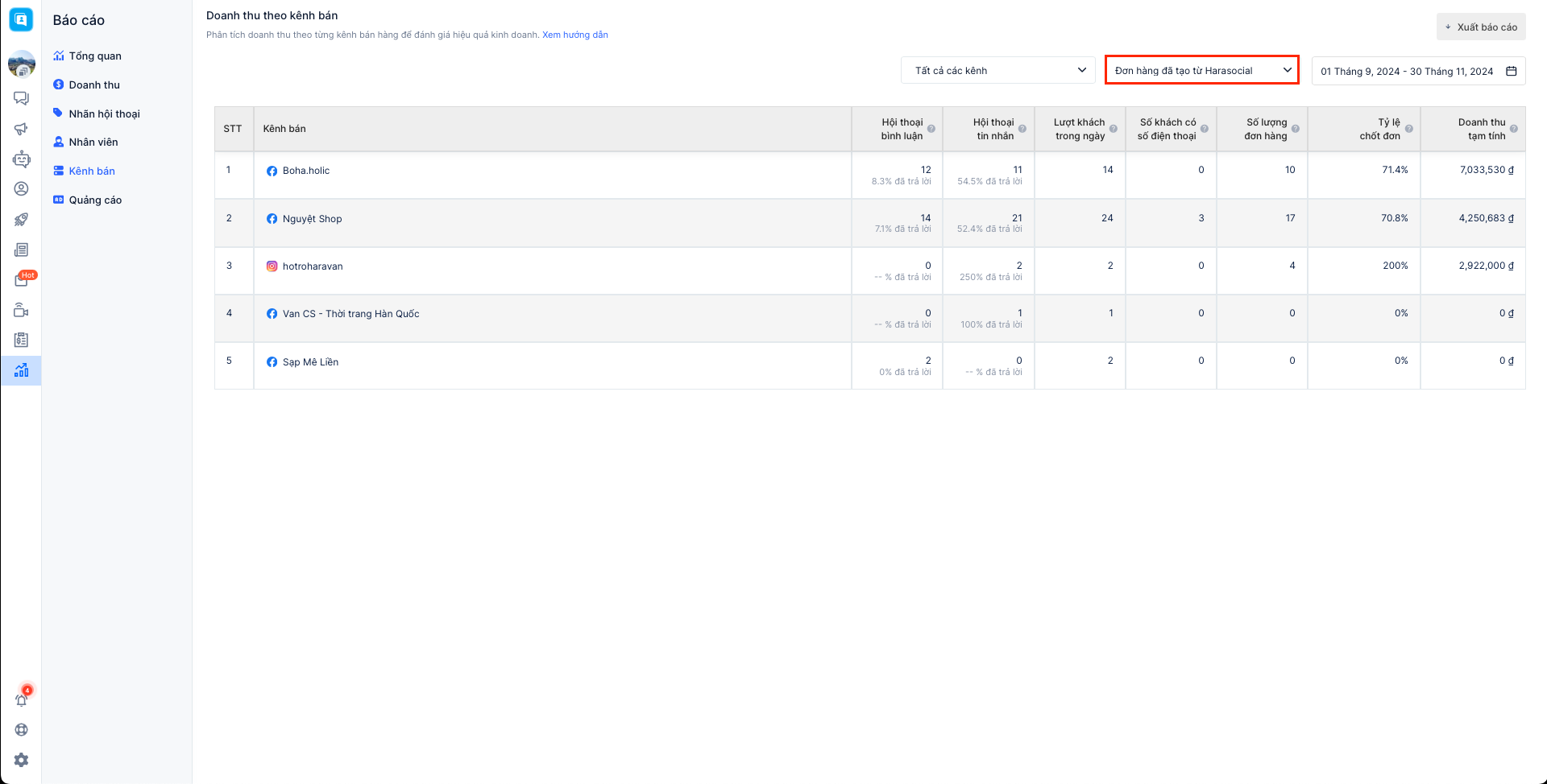 Báo cáo bán hàng theo kênh bán cho phép người bán theo dõi được các chỉ số tiếp nhận khách hàng, tin nhắn, doanh thu các đơn hàng theo từng kênh bán. Hiện tại Harasocial đang hỗ trợ xem báo cáo dành cho 3 kênh: Facebook, Instagram, Zalo và chưa hỗ trợ lọc cho kênh Shopee.