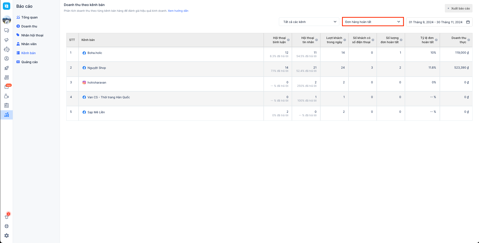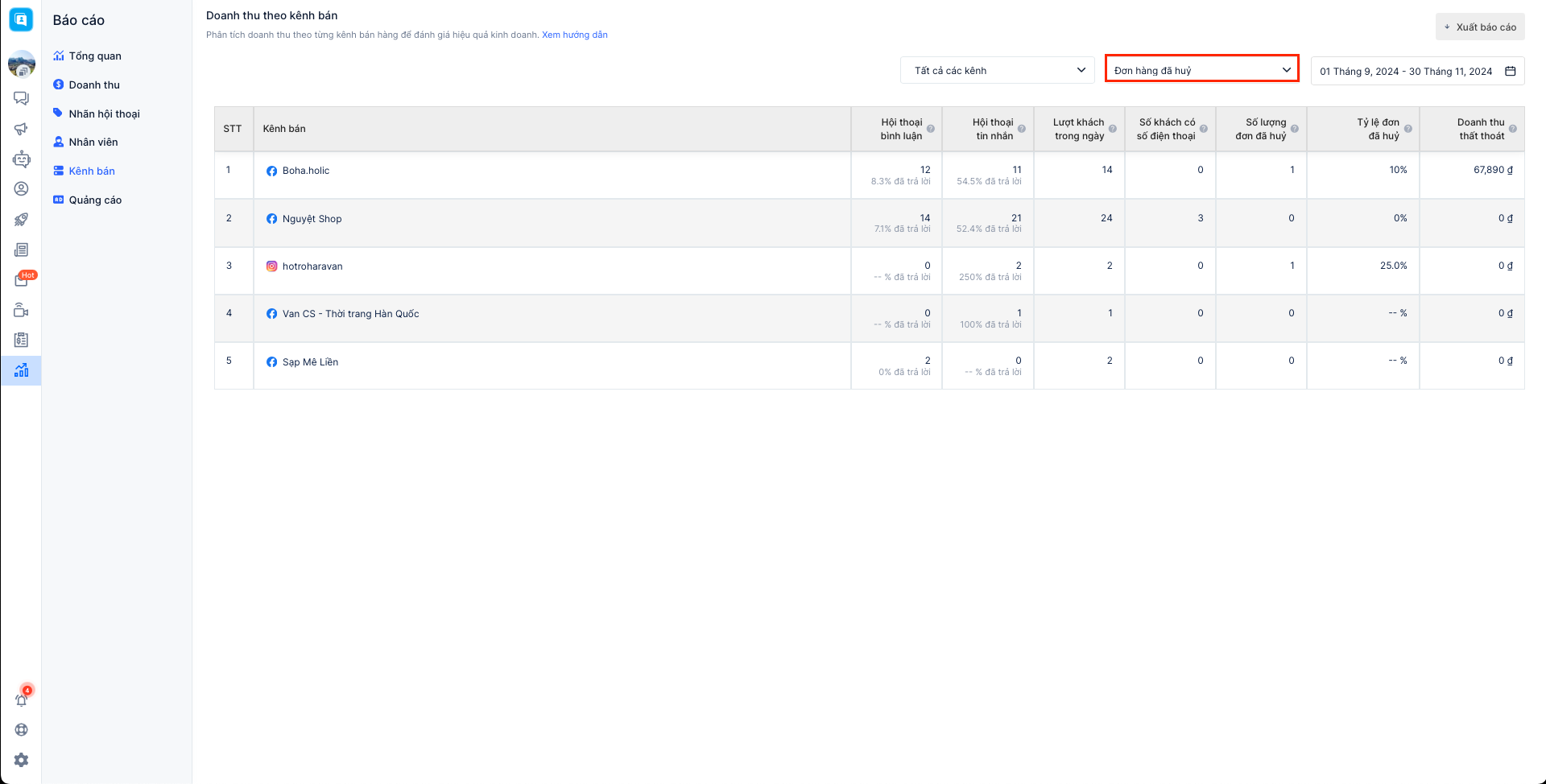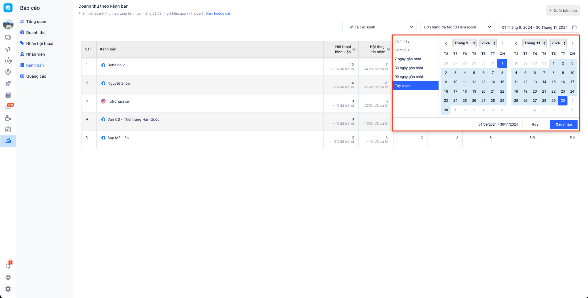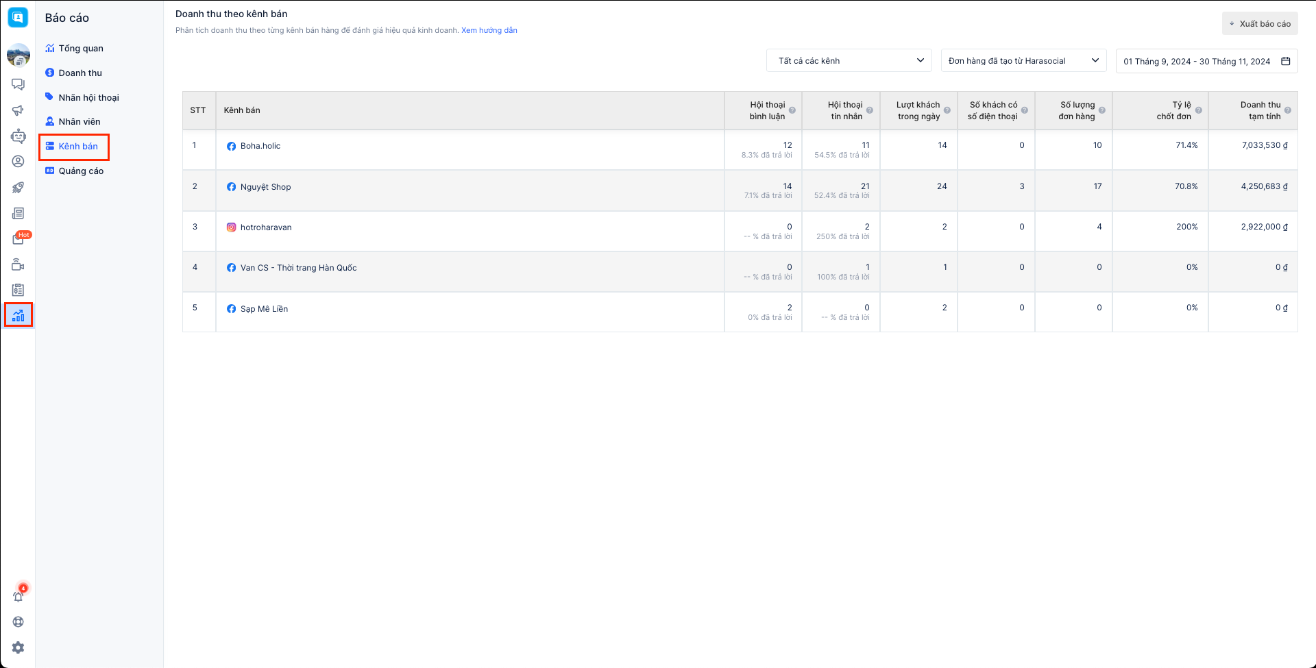Báo cáo bán hàng theo kênh bán cho phép người bán theo dõi được các chỉ số tiếp nhận khách hàng, tin nhắn, doanh thu các đơn hàng theo từng kênh bán. Hiện tại Harasocial đang hỗ trợ xem báo cáo dành cho 3 kênh: Facebook, Instagram, Zalo và chưa hỗ trợ lọc cho kênh Shopee.