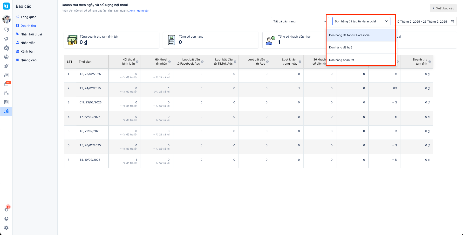 Doanh thu tạm tính: được tính trên tổng giá trị các đơn hàng (không phân biệt trạng thái đơn hàng) đã tạo từ Harasocial, kênh Harasocial.
