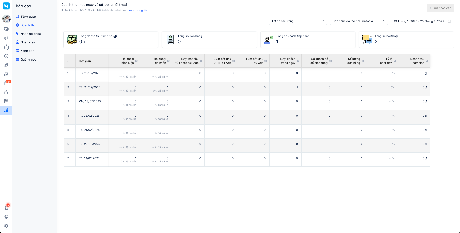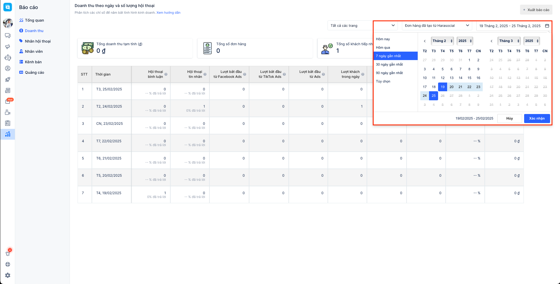Báo cáo doanh thu theo ngày & số lượng hội thoại giúp nhà bán hàng có thể kiểm soát được doanh thu, số lượng khách hàng - đơn hàng - tin nhắn - bình luận nhằm thống kê được hiệu quả chuyển đổi theo từng ngày.