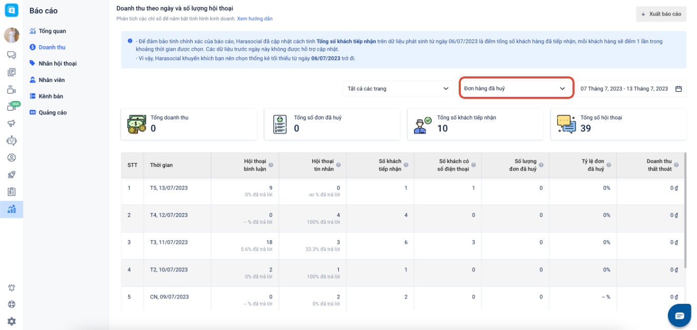 Lưu ý: Báo cáo doanh thu theo ngày & số lượng hội thoại chưa hỗ trợ lọc cho kênh Shopee.