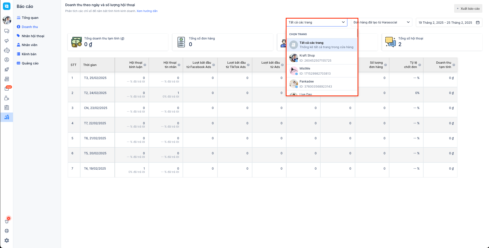 Bạn có thể chọn để xem báo cáo cho tất cả các Fanpage đang kết nối vào Harasocial hoặc có thể chọn ra 1 trang để xem chi tiết, hiện tại Harasocial đang liên kết với 3 kênh bao gồm: Facebook Messenger, Instagram, Zalo.