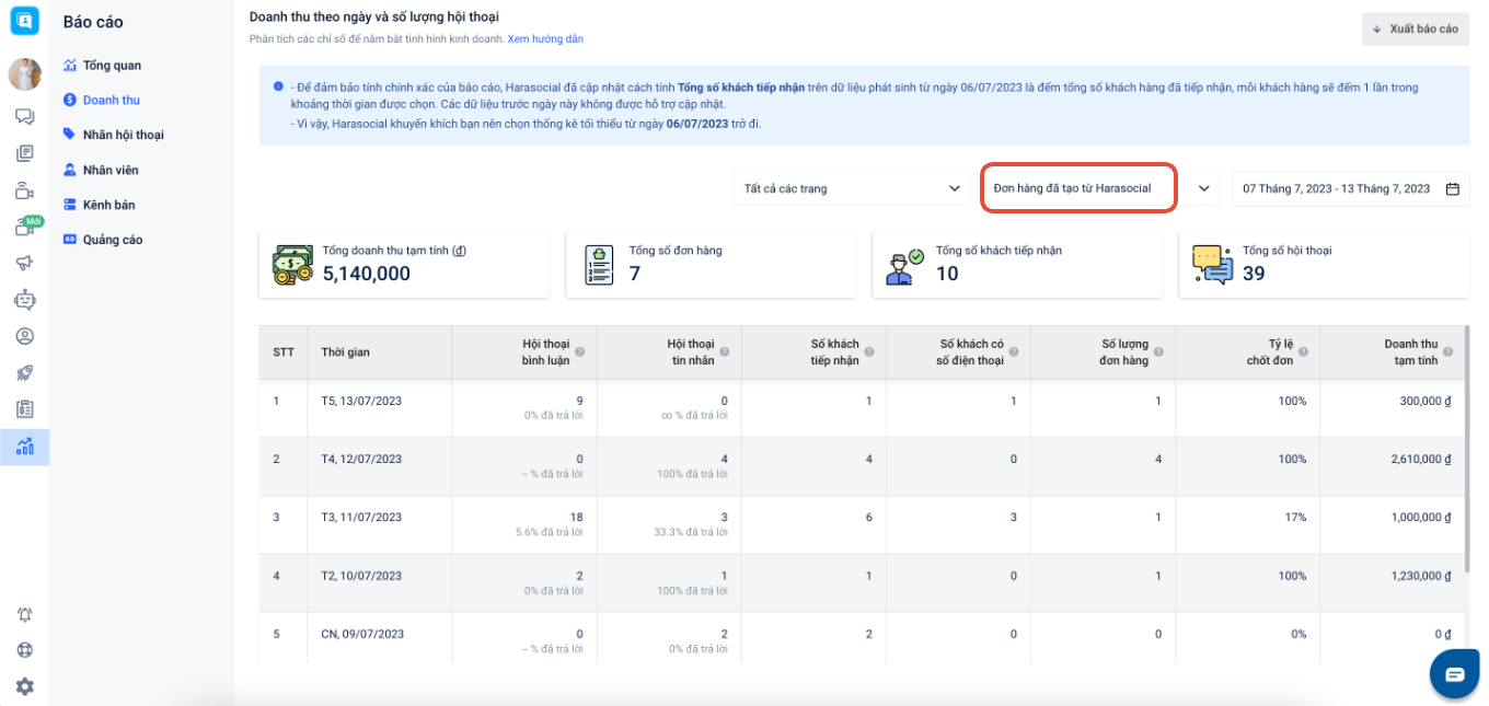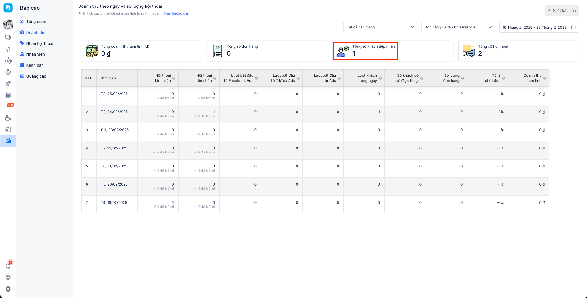 - Để đảm bảo tính chính xác của báo cáo, Harasocial đã cập nhật cách tính Tổng số khách tiếp nhận trên dữ liệu phát sinh từ ngày 06/07/2023 là đếm tổng số khách hàng đã tiếp nhận, mỗi khách hàng sẽ đếm 1 lầntrong khoảng thời gian được chọn. Các dữ liệu trước ngày này không được hỗ trợ cập nhật, nên khuyến khích bạn nên chọn thống kê tối thiểu từ ngày 06/07/2023 trở đi.