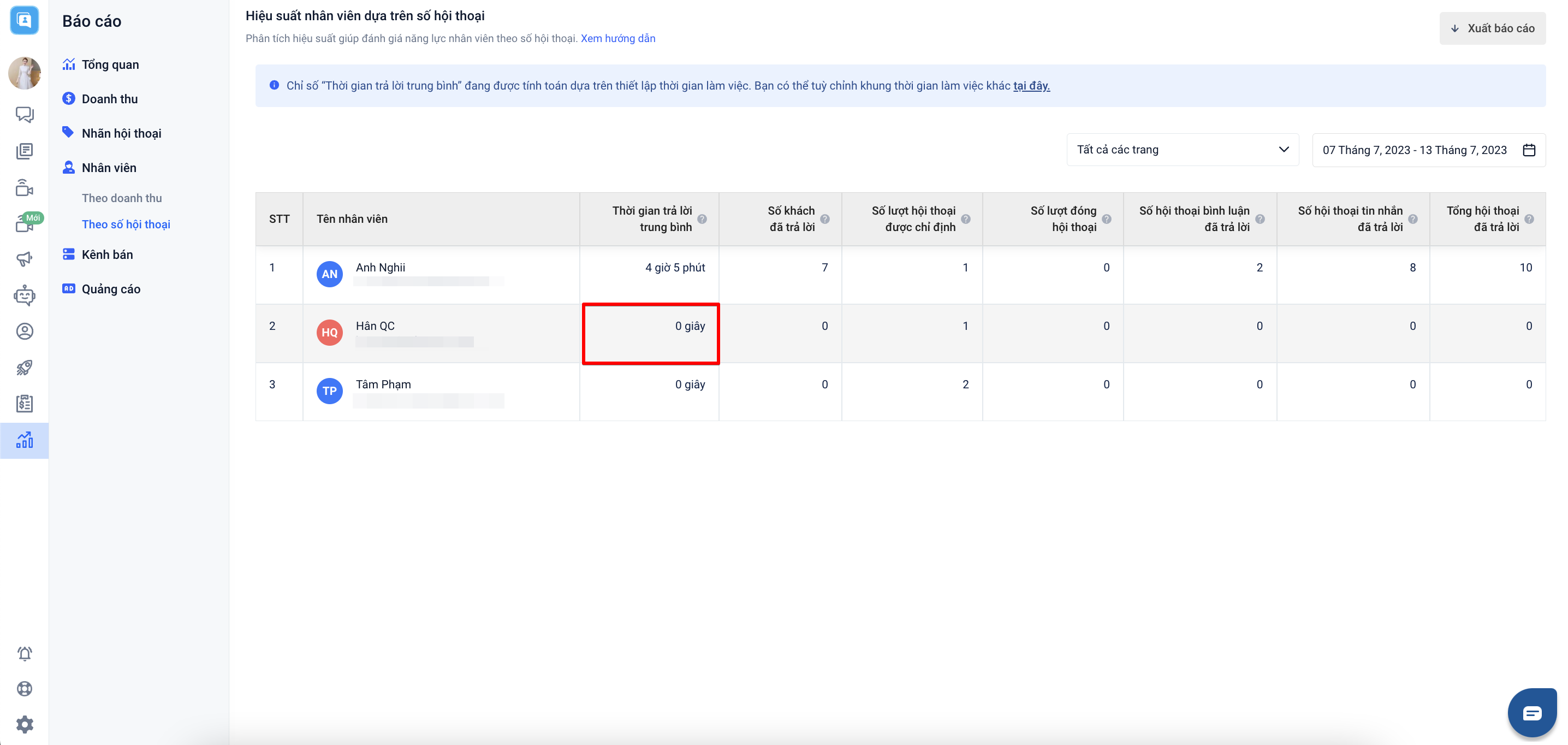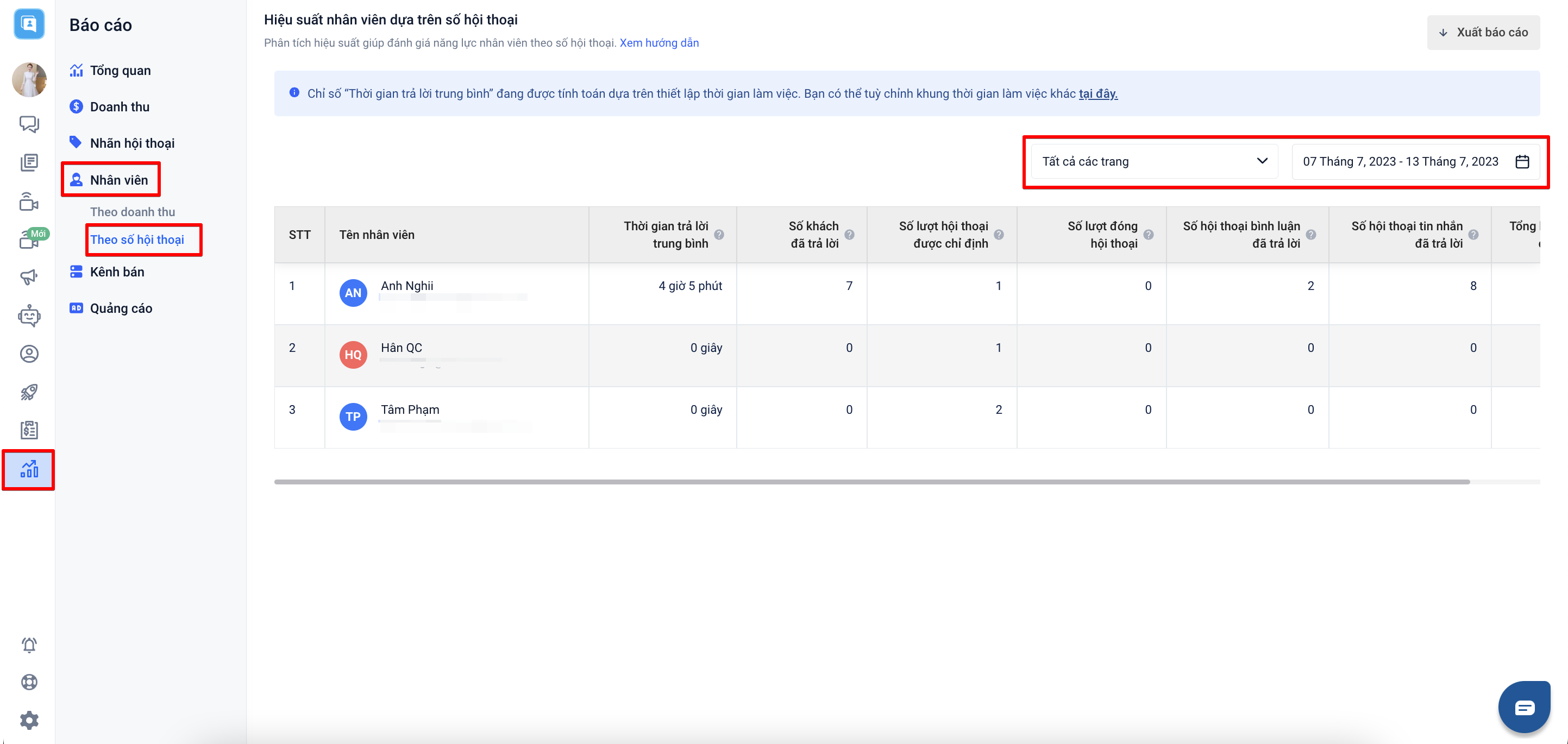 Báo cáo này sẽ hỗ trợ bạn có thể xem được hiệu quả làm việc của nhân viên trong việc chăm sóc khách hàng thông qua các hội thoại mà họ đã xử lý. Qua đó sẽ có phương án khen thưởng, khích lệ hoặc thay đổi cách vận hành hợp lý.