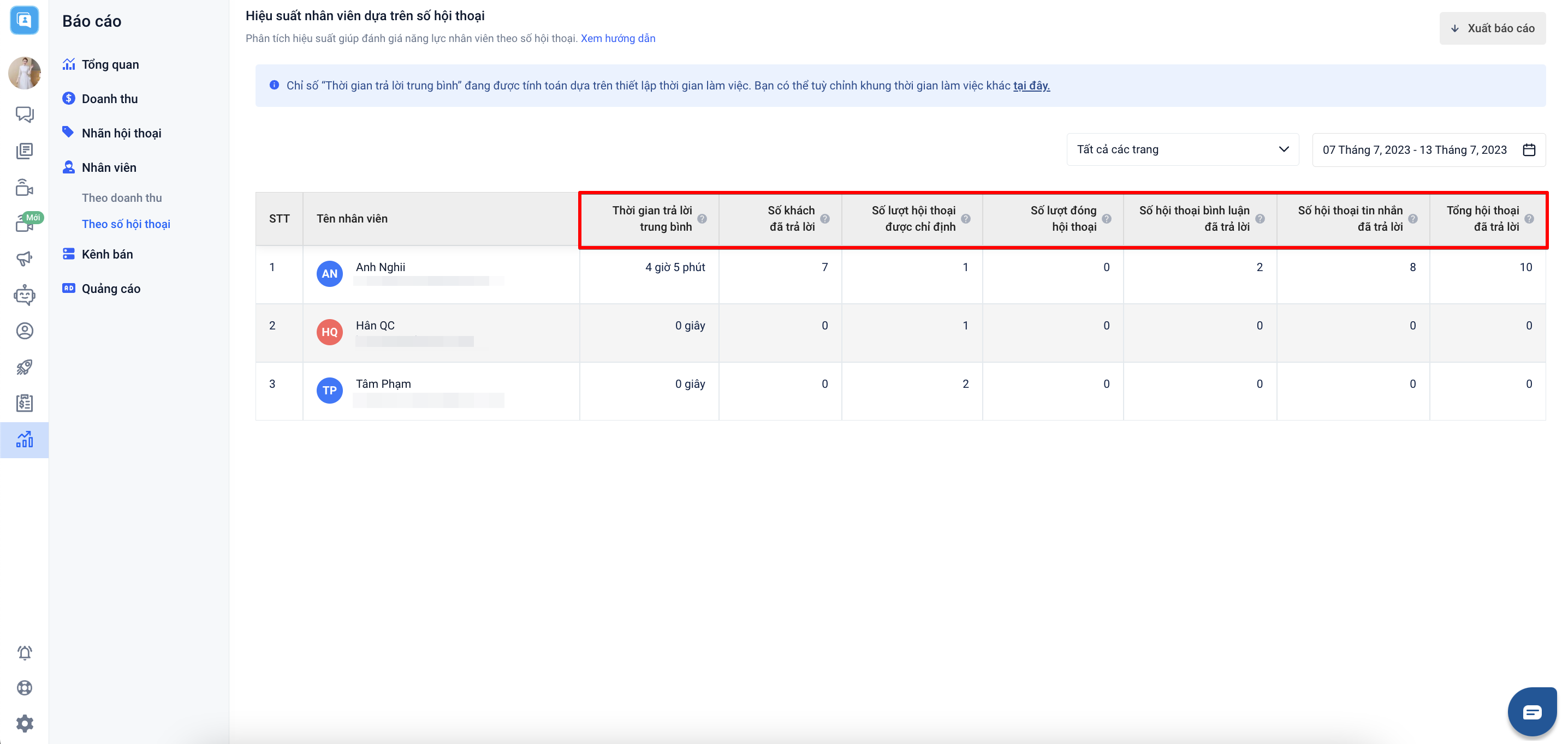 - Số hội thoại tin nhắn đã trả lời: tổng các hội thoại là tin nhắn được nhân viên trả lời, không trừ ngược lại khi xóa tin nhắn.