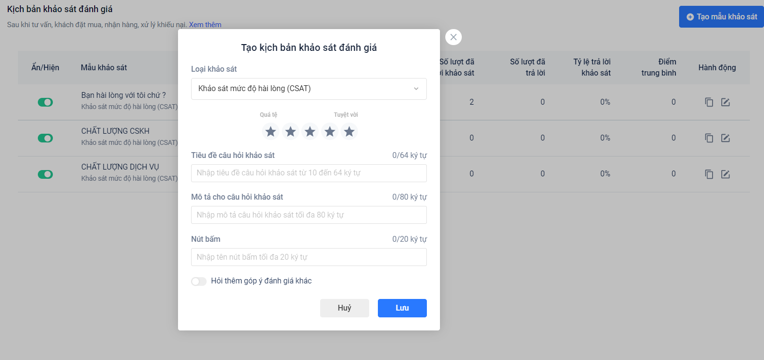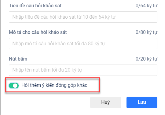 Sau đó bạn chỉ cần nhập mô tả tiêu đề và các câu hỏi khảo sát. Trong trường hợp bạn muốn thu thập thêm các đóng góp ý kiến của khách hàng, bạn bật nút Hỏi thêm ý kiến đóng góp và bấm Lưu