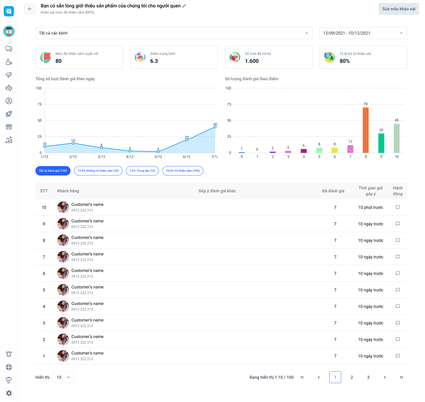 Tùy vào các loại khảo sát, bạn chỉ cần nhấp vào tên mẫu khảo sát bạn muốn xem chi tiết, hệ thống sẽ di chuyển đến toàn trang báo cáo của mẫu khảo sát đó. Tại đây bạn có thể lọc theo trang và ngày để xem chi tiết. Bên cạnh đó còn có các chỉ số báo cáo, sơ đồ biểu thị, các nội dung góp ý đánh giá của khách hàng.