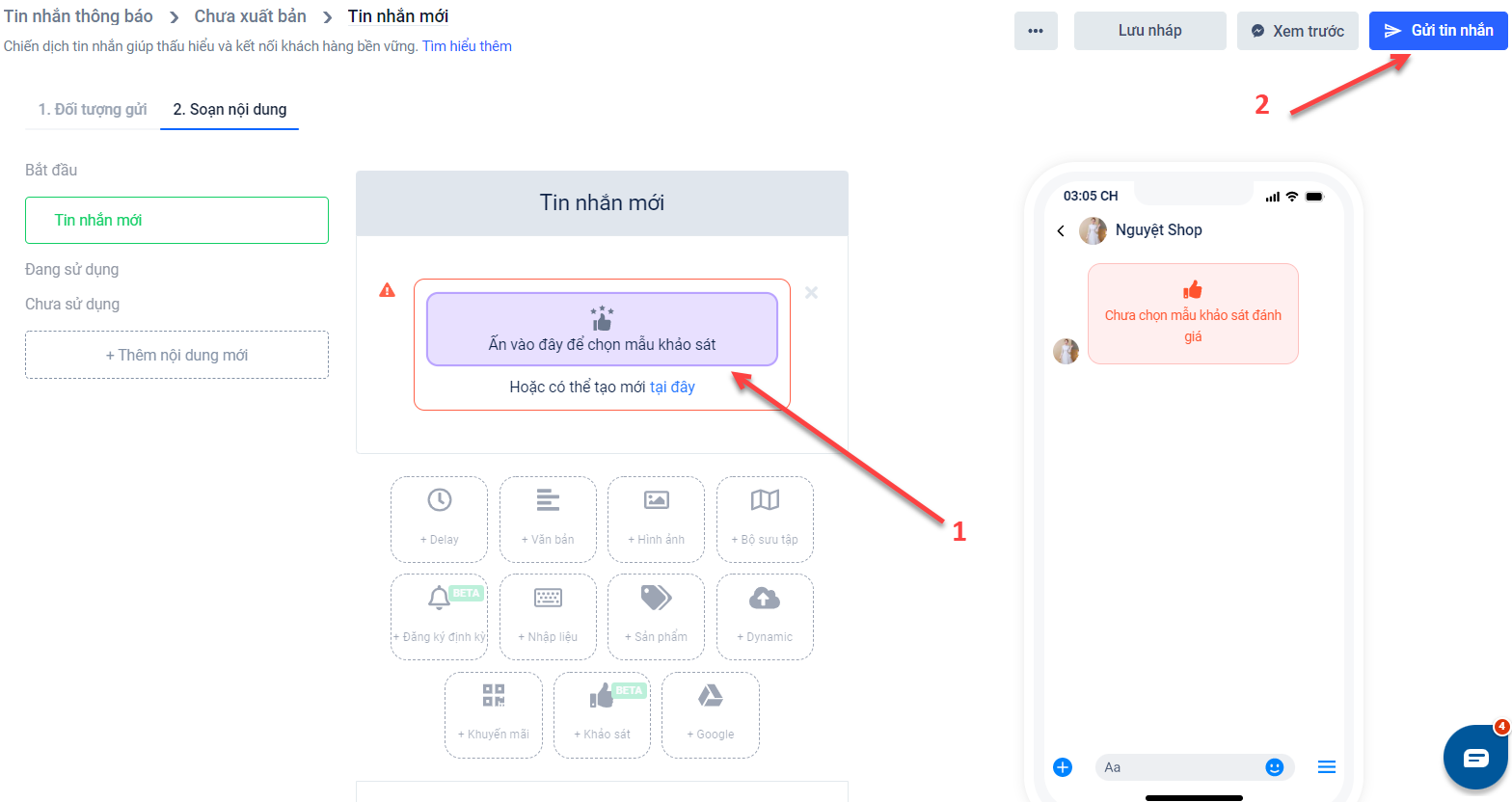 Bạn có thể gửi kịch bản khảo sát đến cho các khách hàng thông qua tin nhắn thông báo: