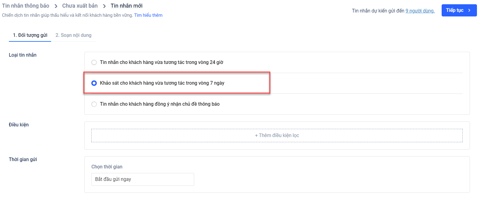 Sau đó lựa chọn kịch bản khảo sát đã tạo và nhấn Gửi tin nhắn: