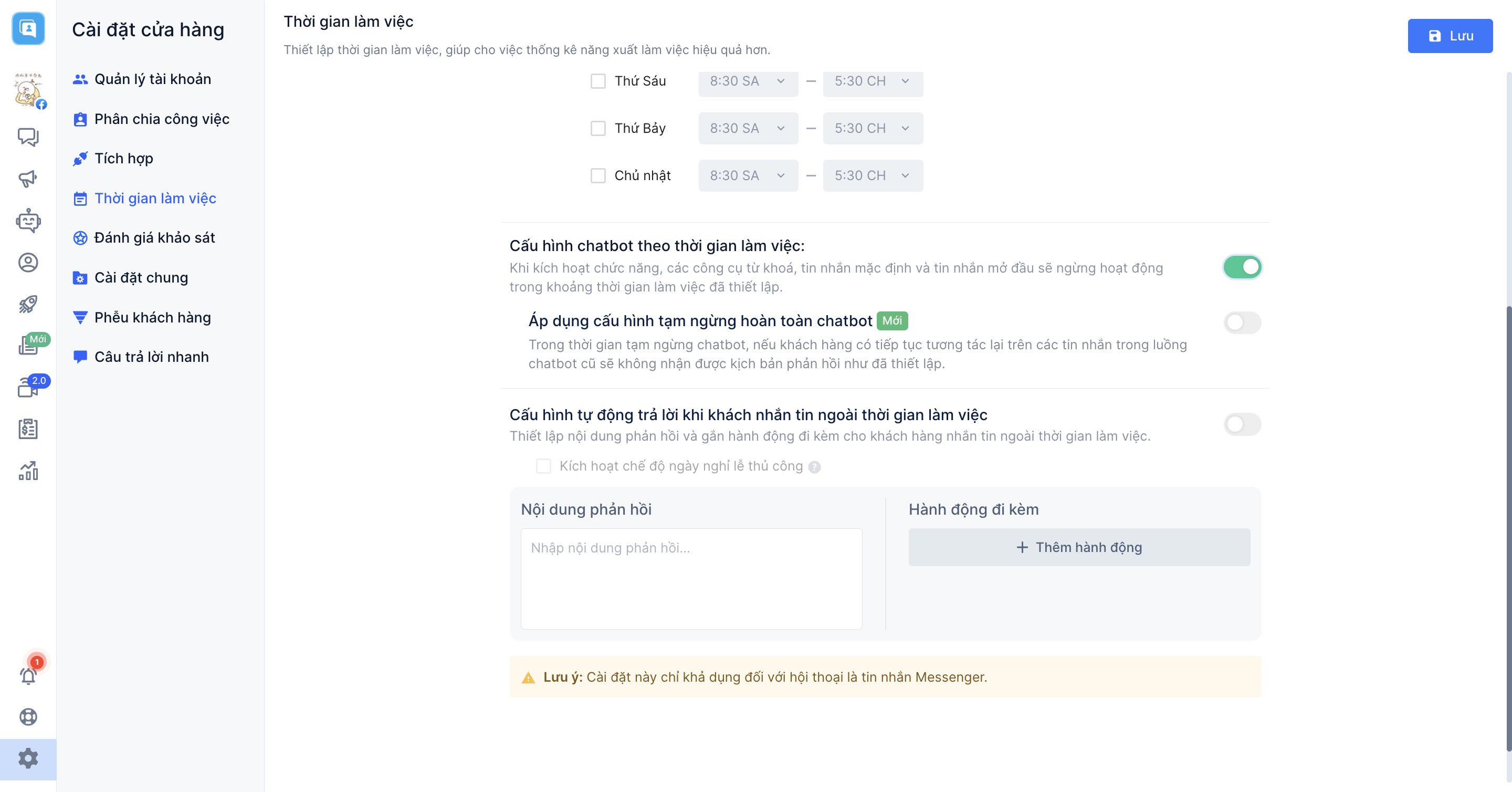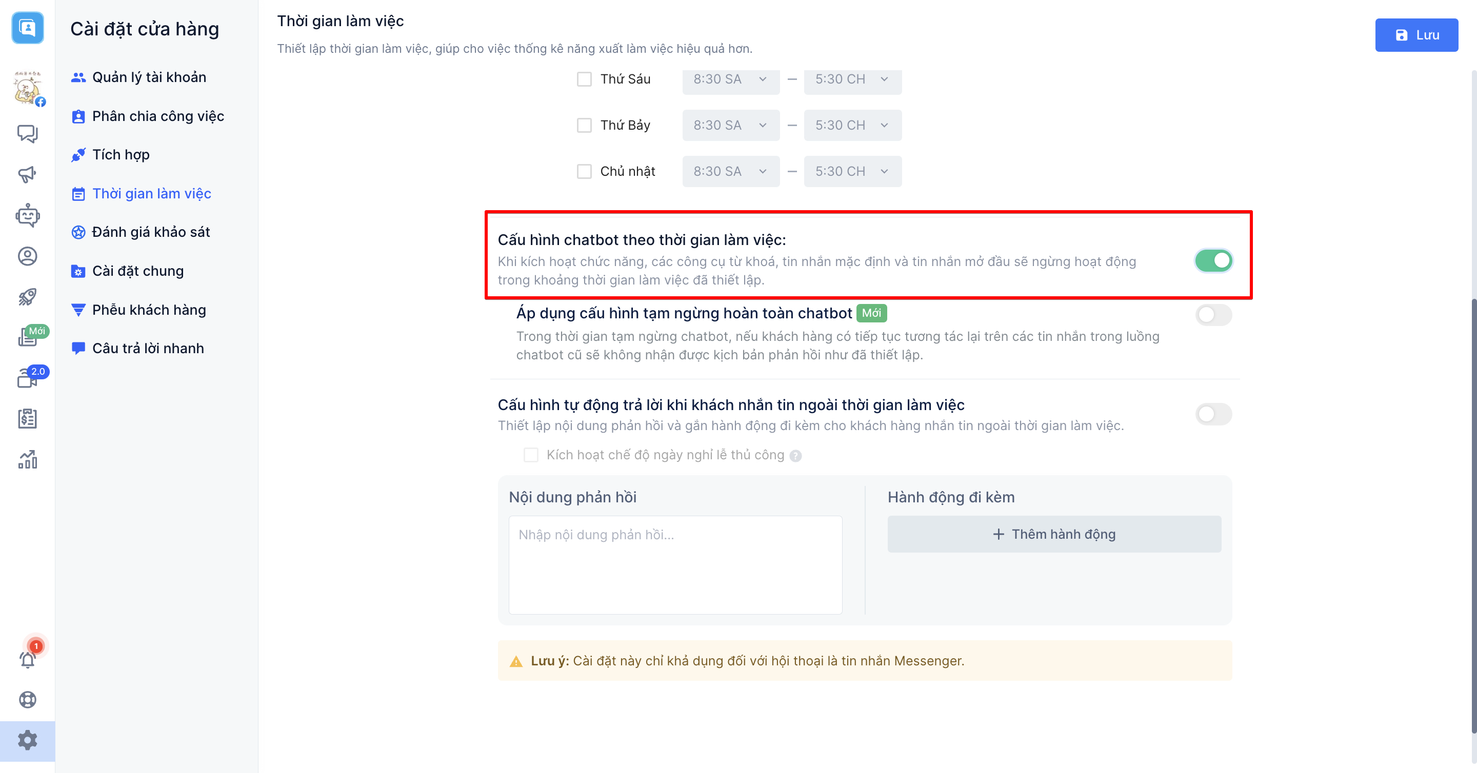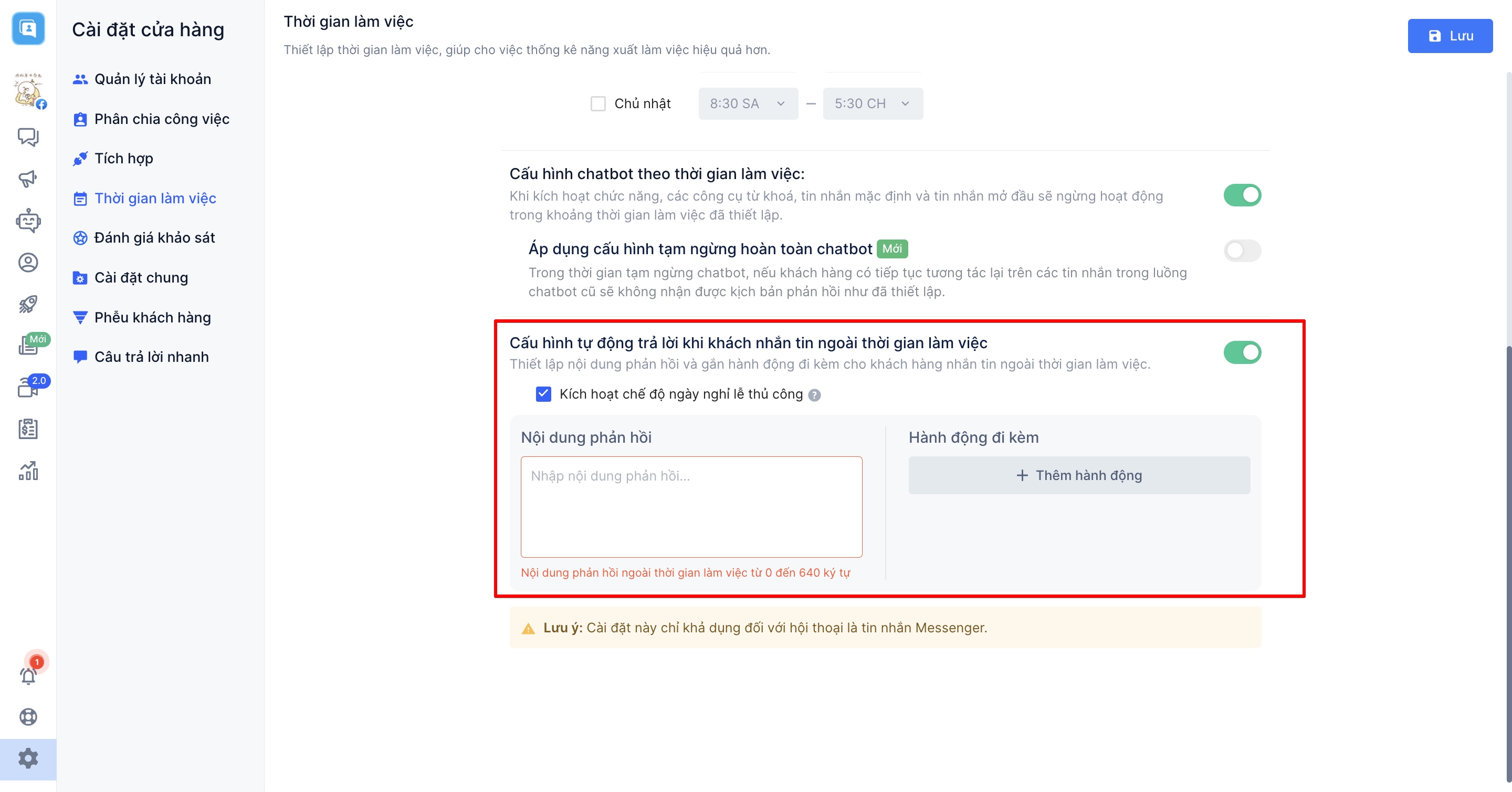 Và cuối cùng là "Cấu hình tự động trả lời khi khách nhắn tin ngoài thời gian làm việc", khi kích hoạt cấu hình này, hệ thống sẽ tự động gửi một nội dung phản hồi ngắn và có thể gắn thêm hành động đi kèm mà bạn thiết lập đến cho khách hàng nhắn tin đến shop ngoài thời gian làm việc.