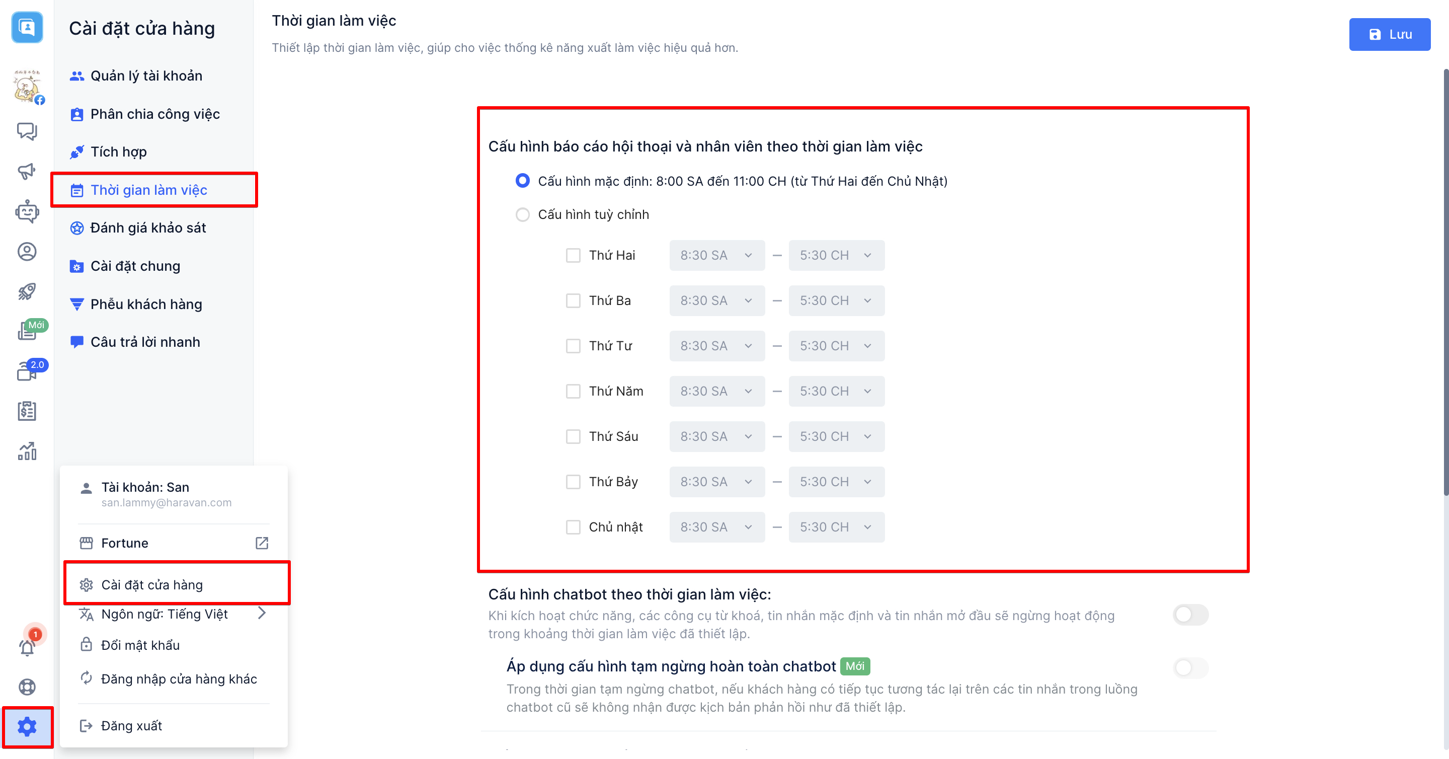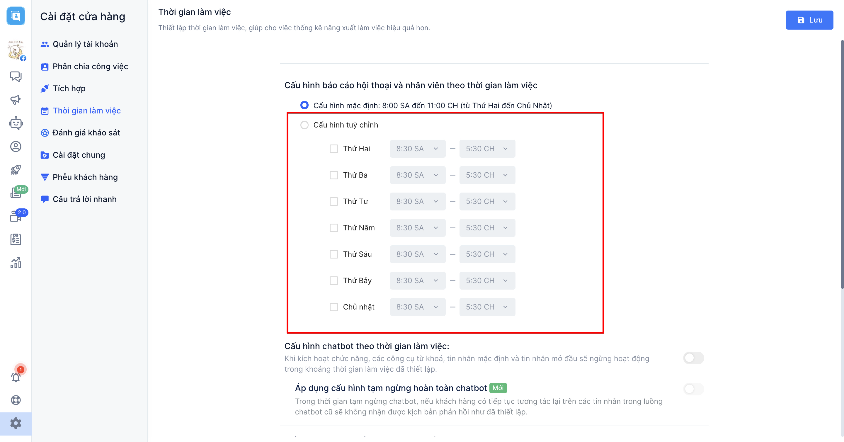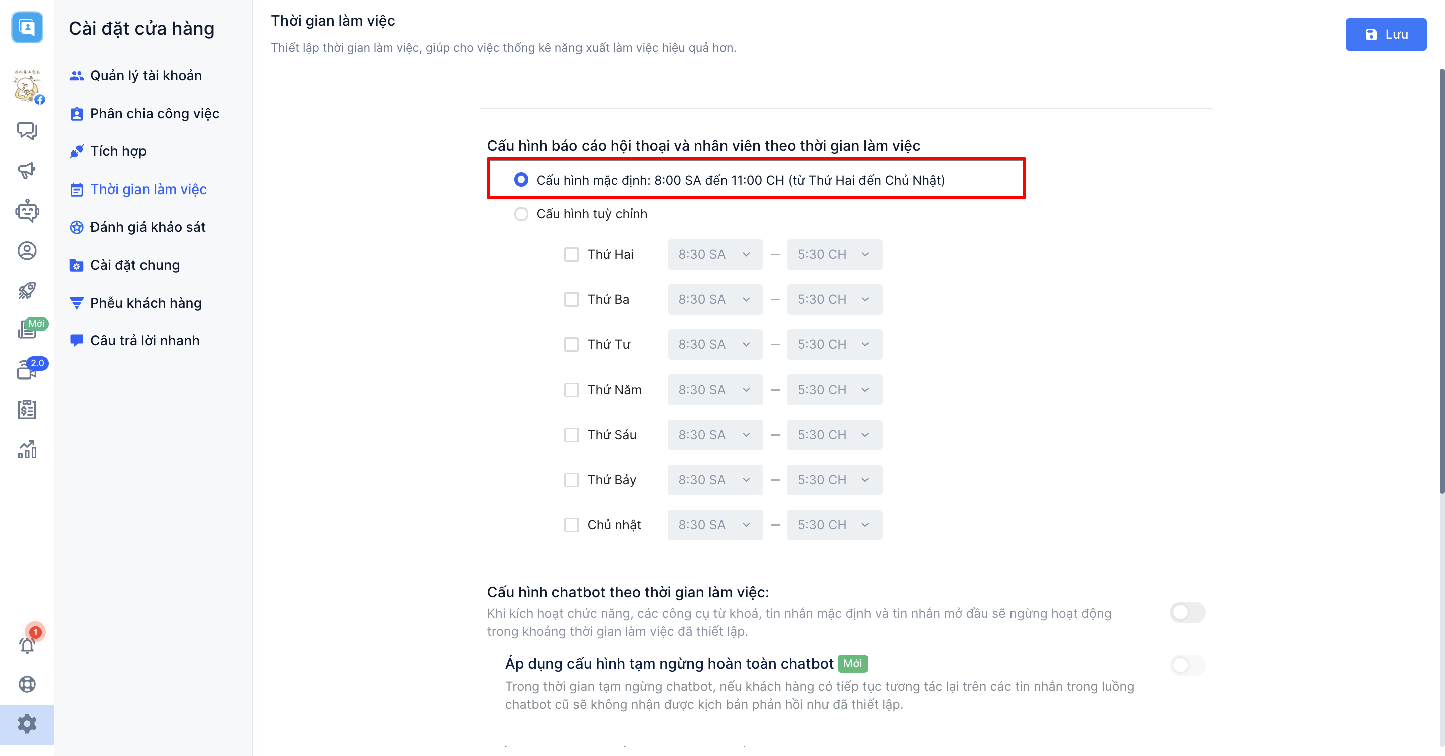 Hoặc nếu như bạn chưa cài đặt thời gian làm việc, hệ thống sẽ tự động thiết lập thời gian mặc định từ 8 giờ tới 23 giờ (từ thứ 2 tới chủ nhật)
