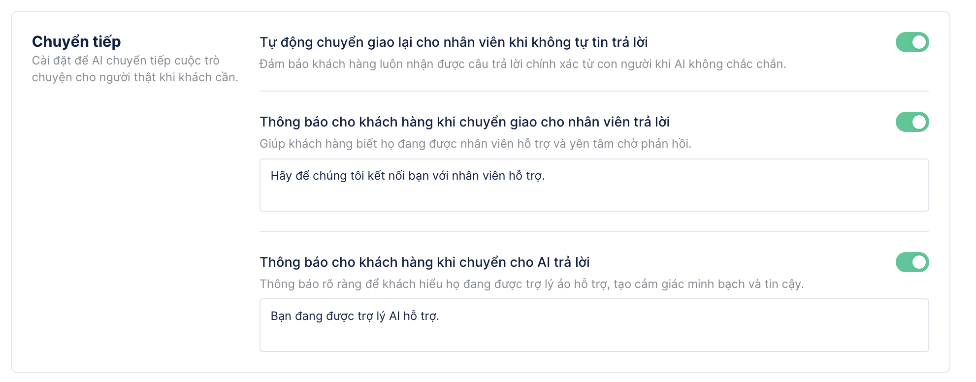 - Tự động chuyển cho nhân viên khi gặp câu hỏi khó và thông báo rõ ràng cho khách hàng trong suốt quá trình.