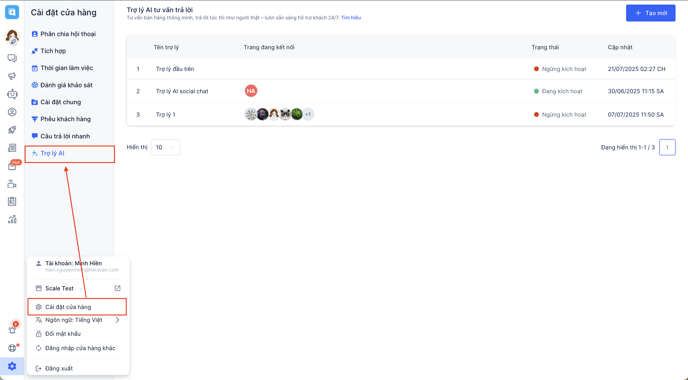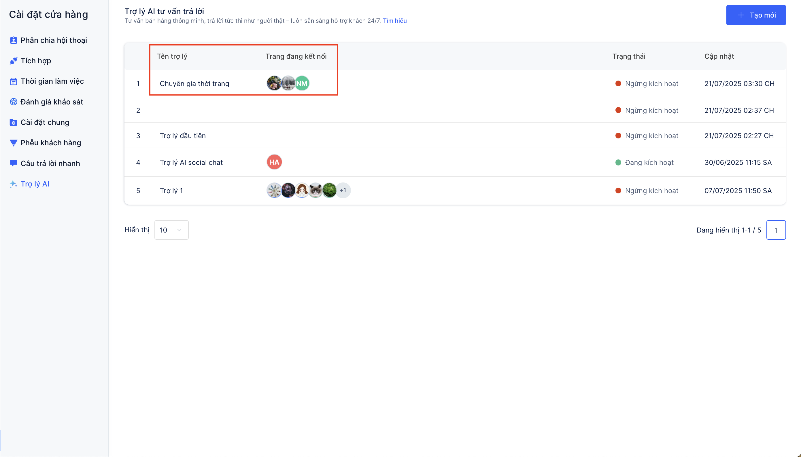 - Xem danh sách trợ lý AI bao gồm: Tên trợ lý, trang đang kết nối với trợ lý AI, trạng thái hoạt động của trợ lý AI và thời gian cập nhật thông tin cho trợ lý AI.