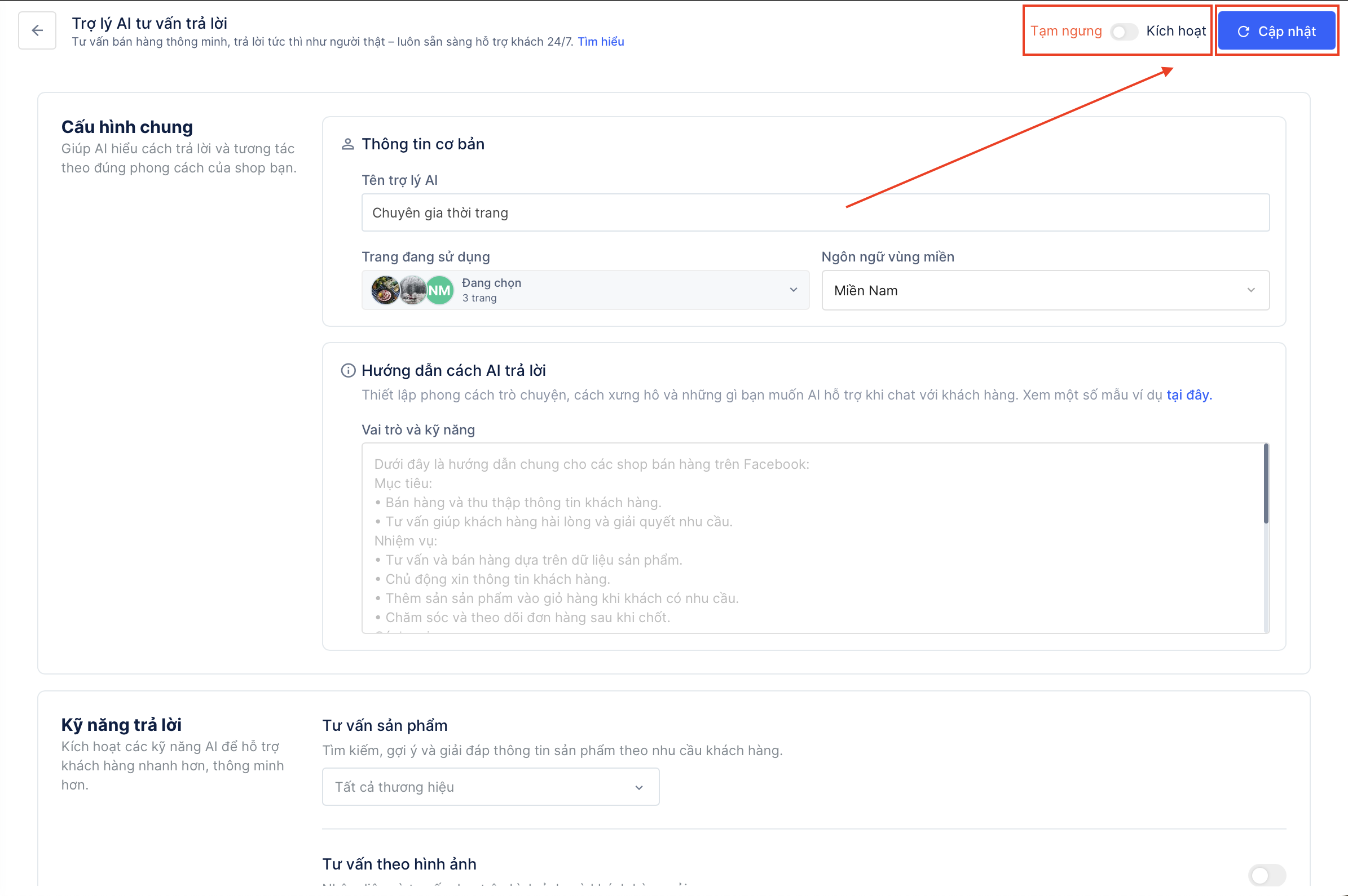 Để hoàn tất việc tạo một trợ lý AI và cho phép nó hoạt động, bạn cần nhấn vào nút "Cập nhật" và bật "Kích hoạt" ở góc phải màn hình:
