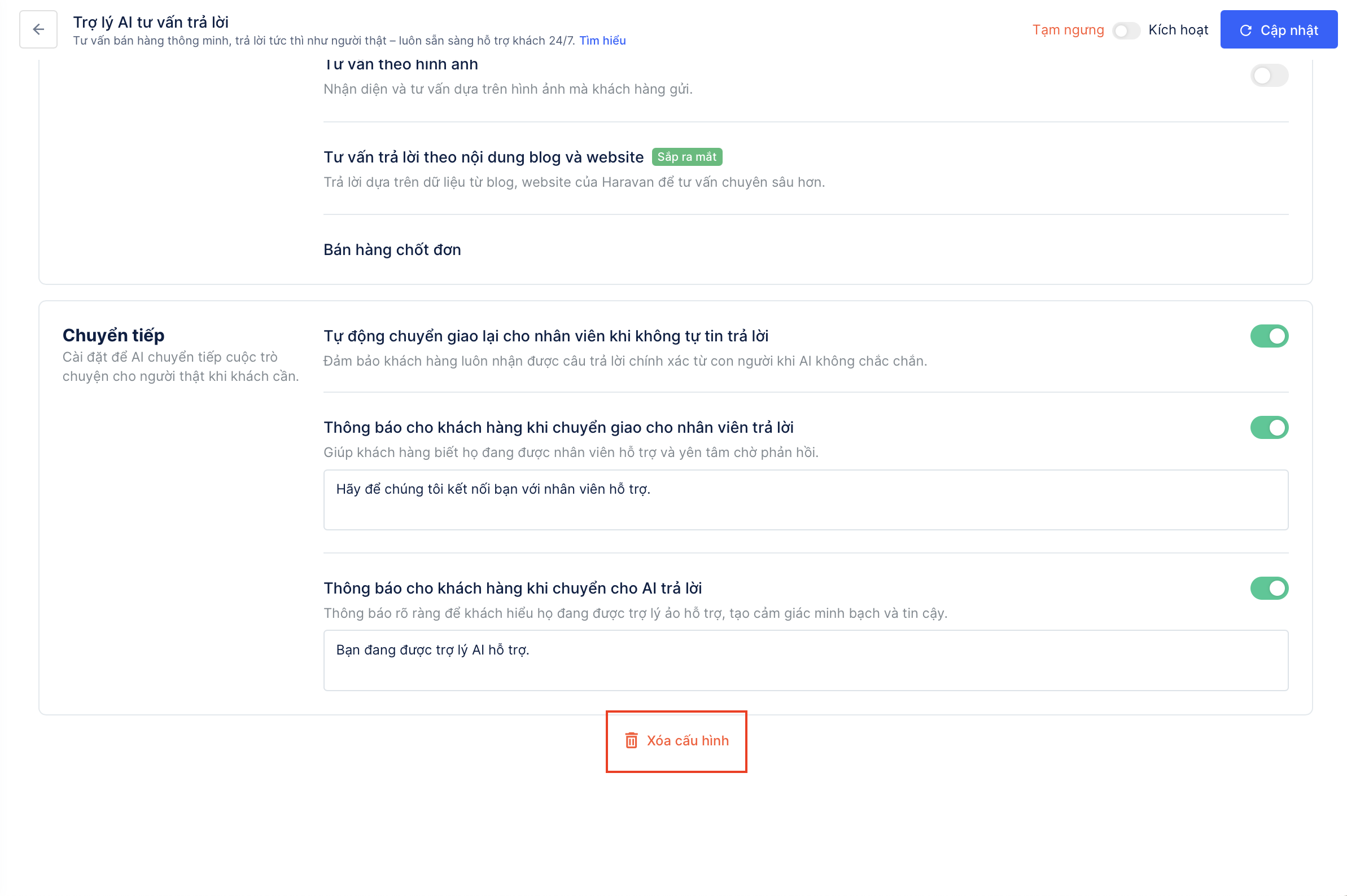 - Trợ lý AI tự động chuyển giao lại tin nhắn cho nhân viên khi không tự tin trả lời.