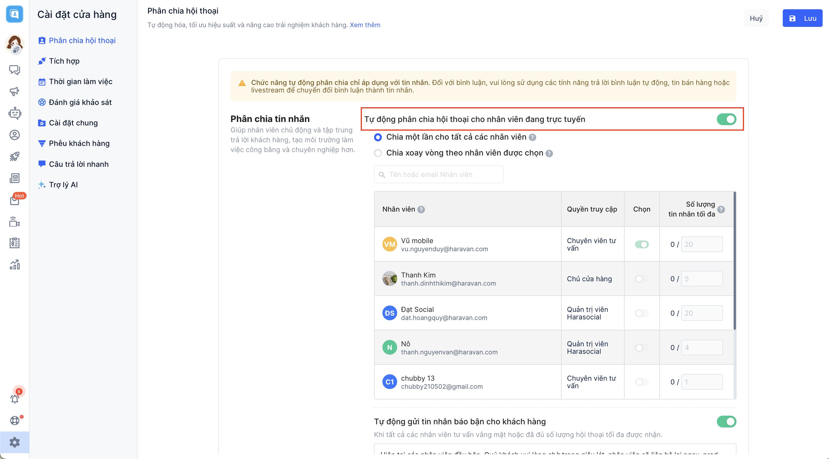Nếu tắt cấu hình phân chia hội thoại tự động, thì tính năng "Tự động chuyển tiếp cho nhân viên khi không tự tin trả lời" sẽ hiển thị cảnh báo:
