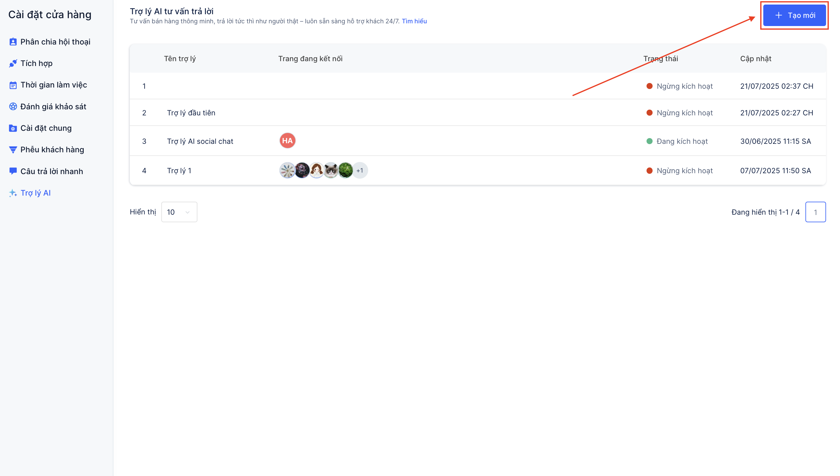 Để tạo mới một trợ lý AI, bạn nhấn vào nút "Tạo mới" ở góc phải màn hình: