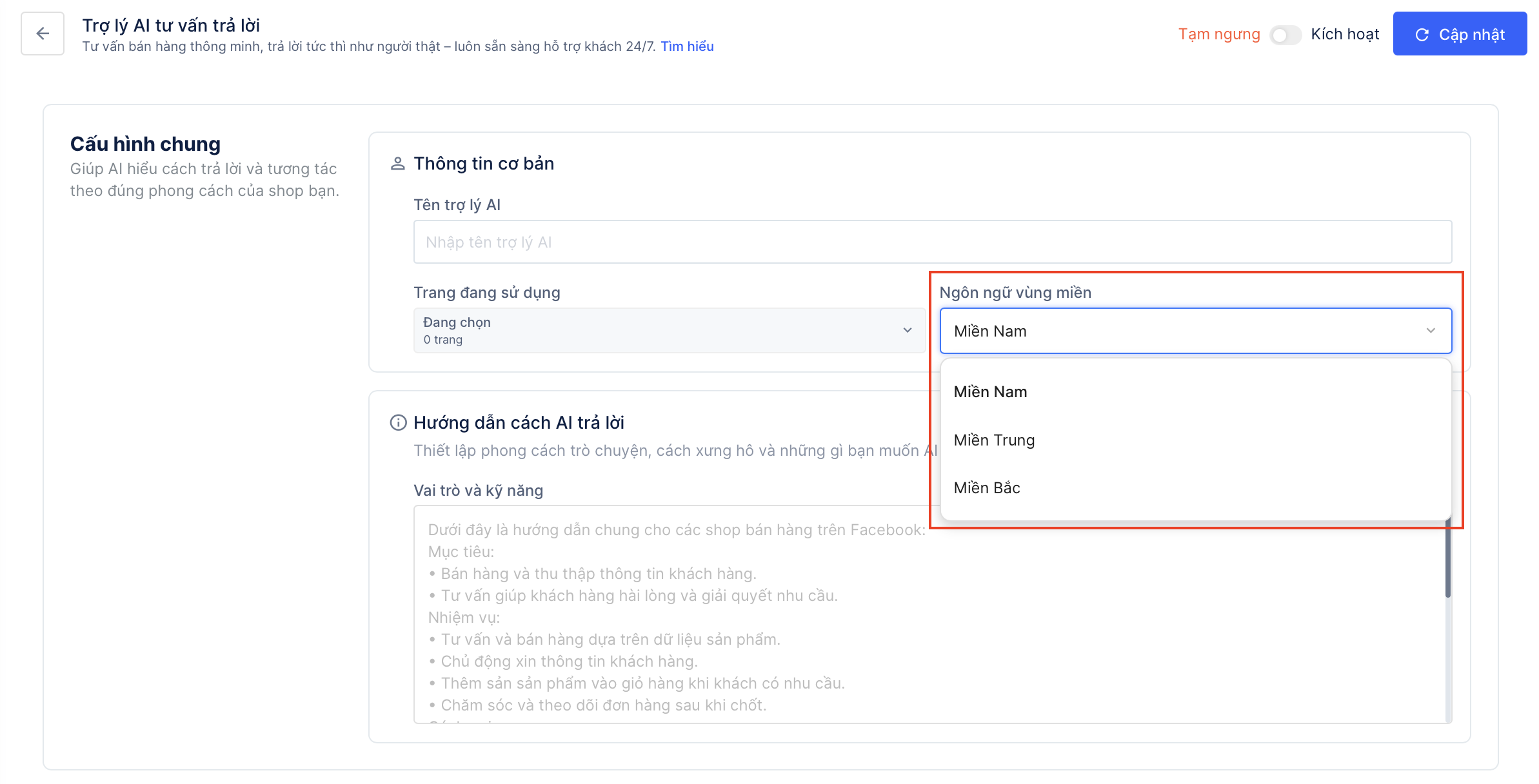 Ngoài ra, bạn có thể thiết lập ngôn ngữ vùng miền cho trợ lý AI. Tại Harasocial, trợ lý AI có thể được thiết lập theo 3 ngôn ngữ miền Nam - Trung- Bắc. Việc chọn ngôn ngữ vùng miền sẽ giúp bạn cá nhân hóa bán hàng cho từng người mua: