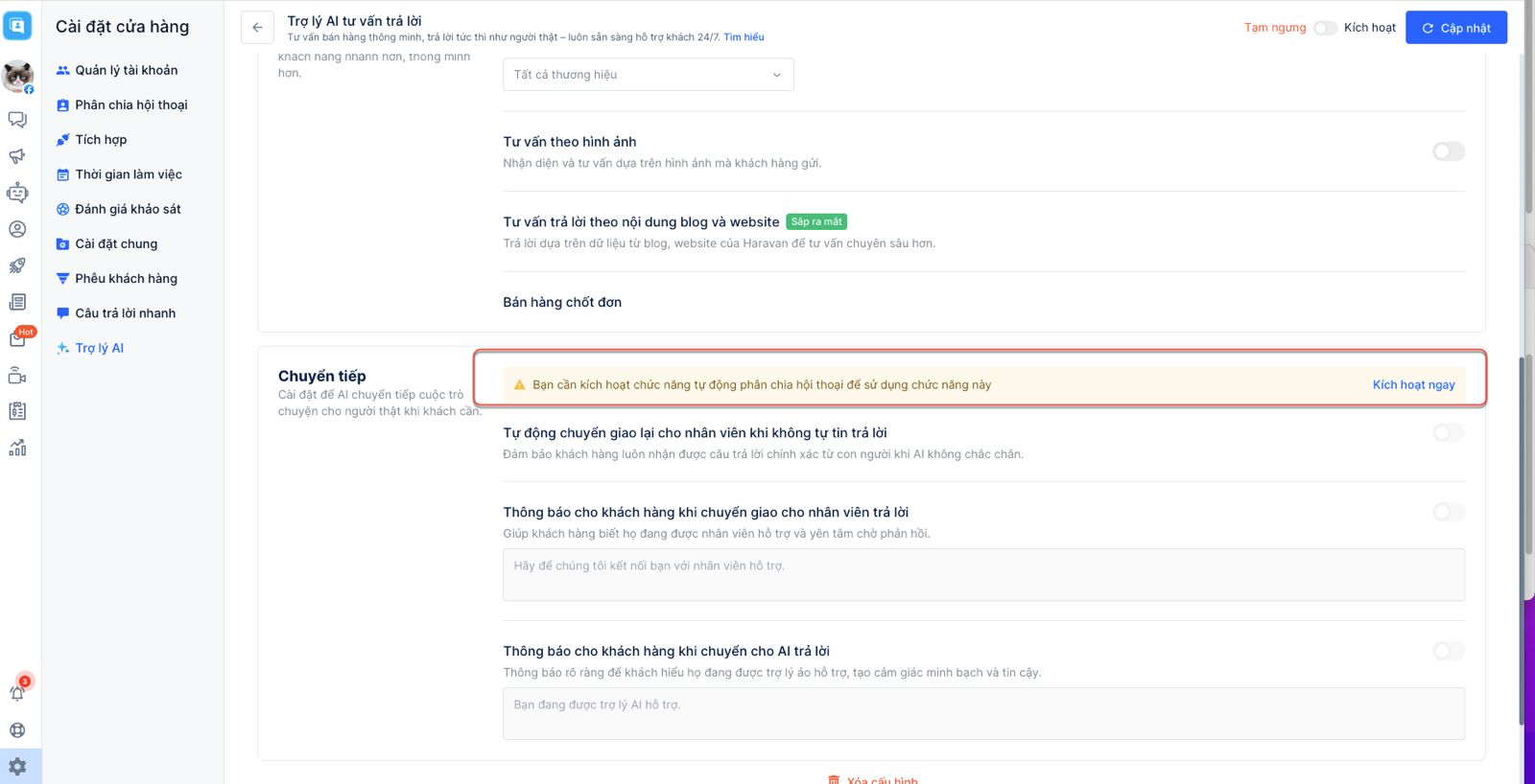 3.5. Thiết lập tính năng chuyển giao tin nhắn giữa trợ lý AI và nhân viên