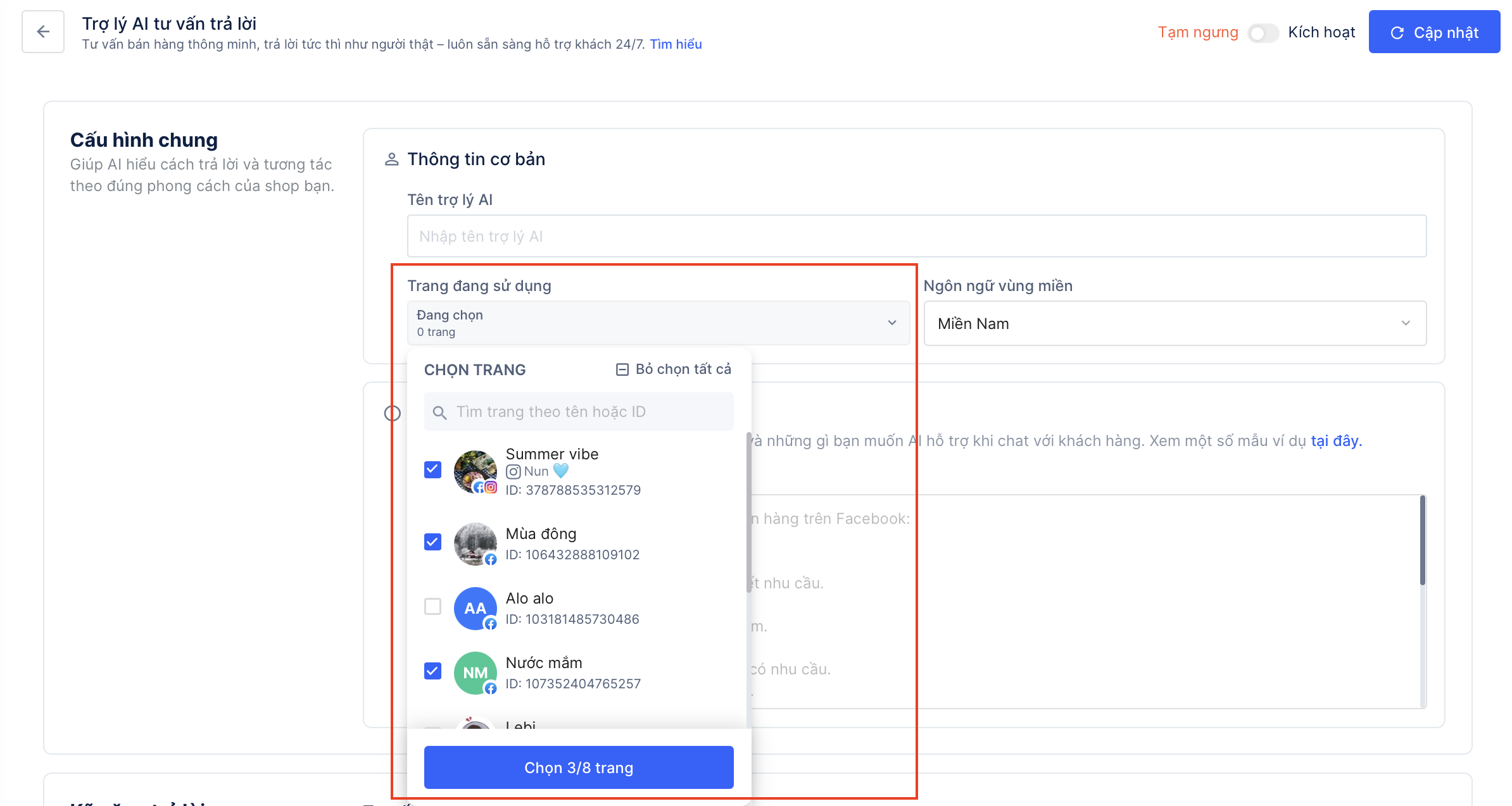 Đồng thời, kết nối những trang website hoặc Fanpage Facebook muốn sử dụng trợ lý AI này bằng cách tick chọn vào trang mình mong muốn và bấm "Chọn trang":