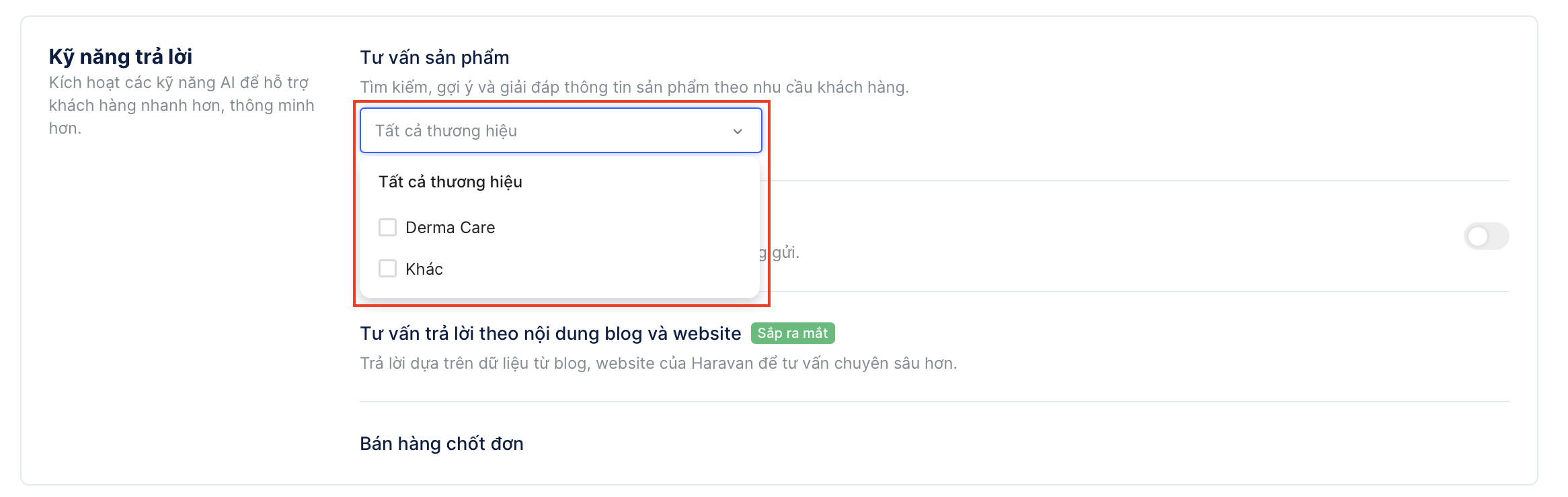 Tính năng này cho phép trợ lý AI tìm kiếm, gợi ý và sản phẩm thông tin sản phẩm theo câu hỏi của khách hàng dựa vào việc nắm bắt từ khóa mà khách hàng nhắn tin. Nhà bán hàng có thể chọn từng thương hiệu sản phẩm mà mình có để trợ lý AI thu thập thông tin và gợi ý cho khách hàng: