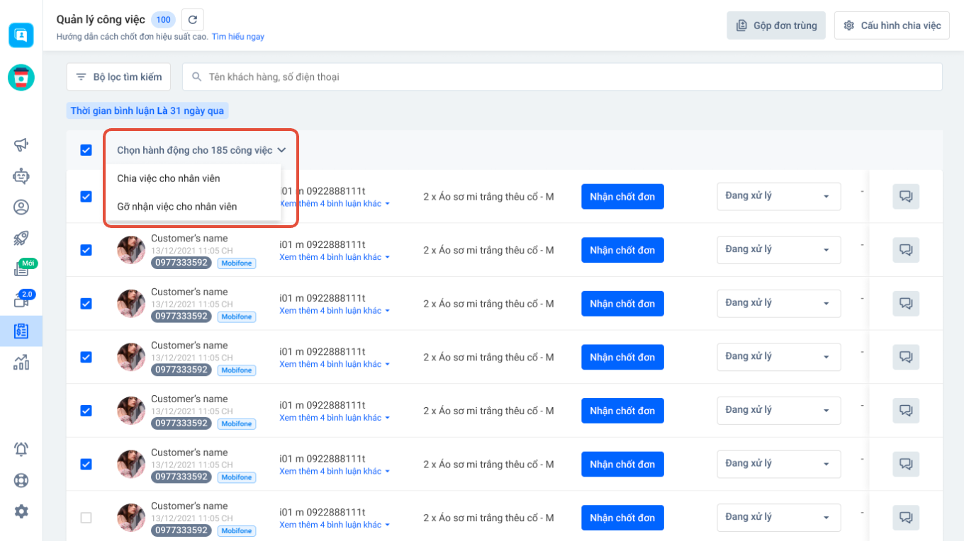 Chủ shop có thể chia hàng loạt các công việc của khách hàng cho nhân viên mà mình muốn.