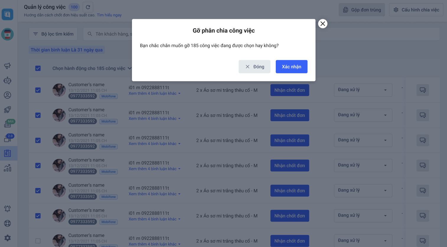Cho phép chủ shop có thể gỡ hàng loạt công việc của các khách hàng đang chọn và có thể chia lại từ đầu