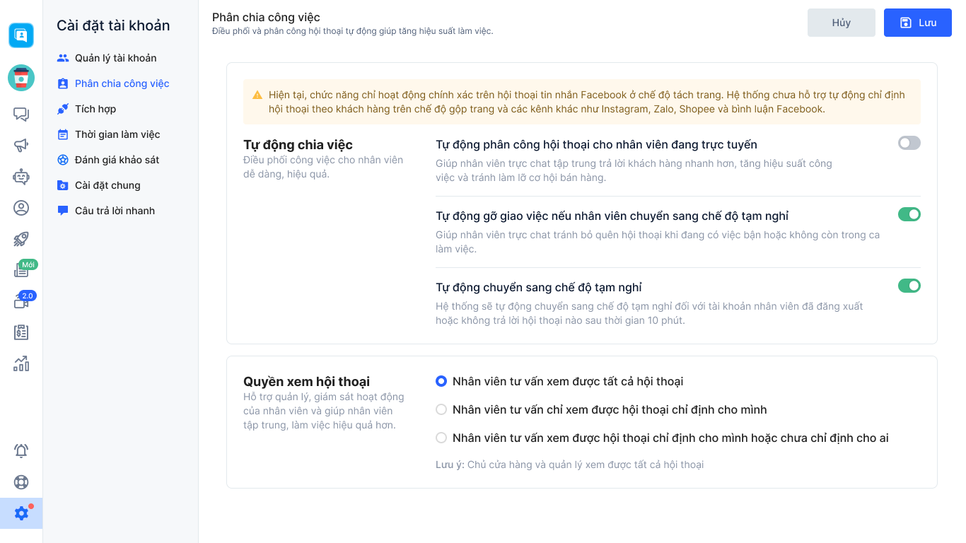 - Chủ cửa hàng và quản lý sẽ xem được tất cả hội thoại.