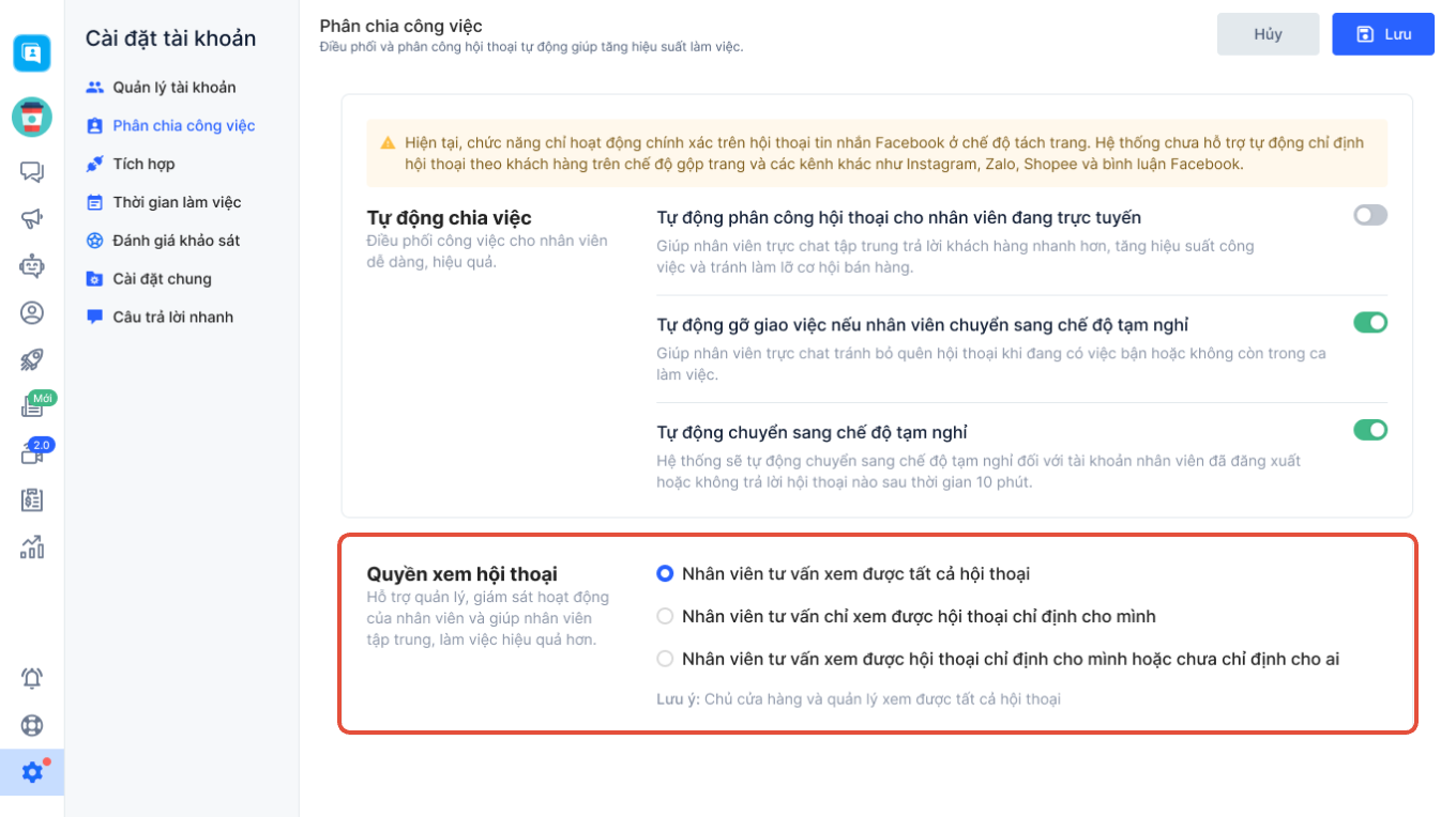 - Nhân viên tư vấn chỉ xem được hội thoại chỉ định cho mình