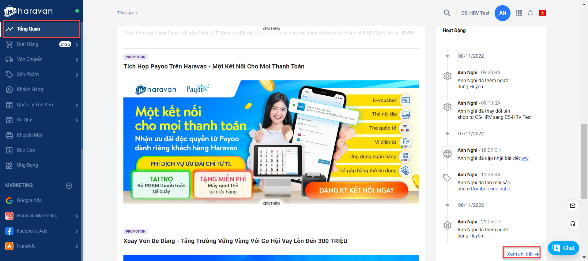 Để xem được phần lịch sử này, tại Trang quản trị Haravan → truy cập mục Tổng quan → chọn Xem chi tiết ở tab Hoạt động.