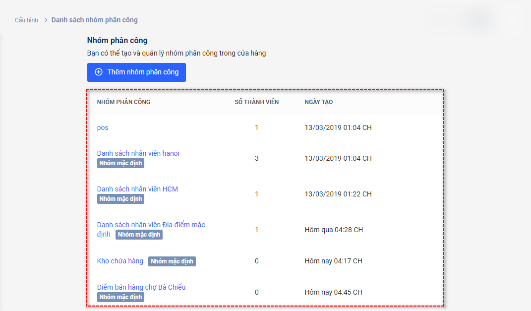 Danh sách nhóm phân công chứa thông tin tất cả nhóm phân công trong trang Haravan. Bằng cách truy cập vào trang Danh sách nhóm phân công, bạn có thể thực hiện các thao tác: Xem, Thêm, Chỉnh sửa, Xóa nhóm phân công.