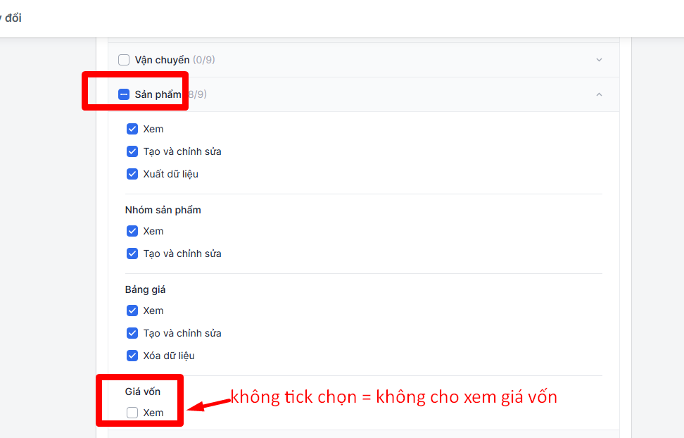 Phân quyền để nhân viên bán hàng KHÔNG xem được giá vốn.