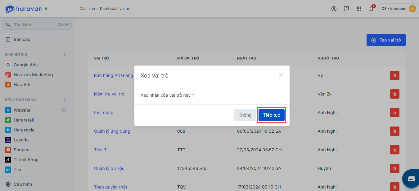 Bước 2:**Chọn Tiếp tục** để xác nhận xoá nhóm vai trò.