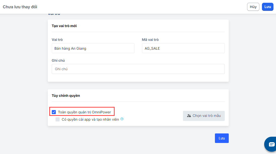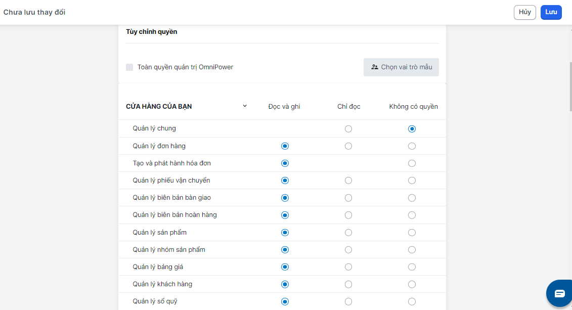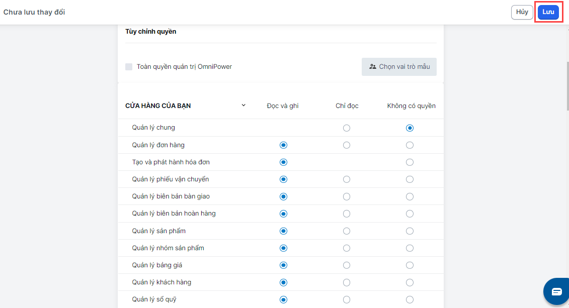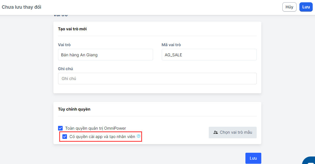 Bước 4Ở phần tuỳ chỉnh quyền, nếu muốn phân cho nhóm mới t**oàn quyền truy cập** các tính năng, bạn hãy giữ nguyên trạng thái mặc định là **Toàn quyền quản trị OmniPower (chưa bao gồm quyền cài app và thêm nhân viên).**