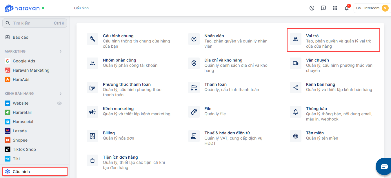 Bước 1 Tại trang quản trị MyHaravan, bạn chọn Cấu hình -> chọn Vai trò