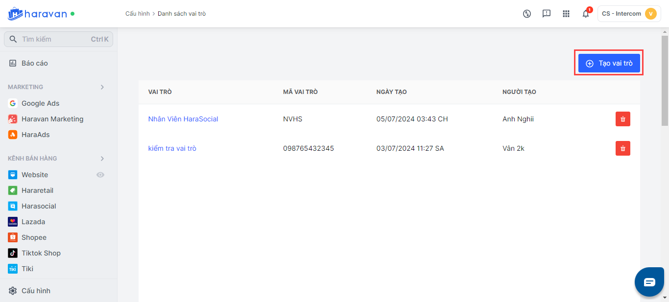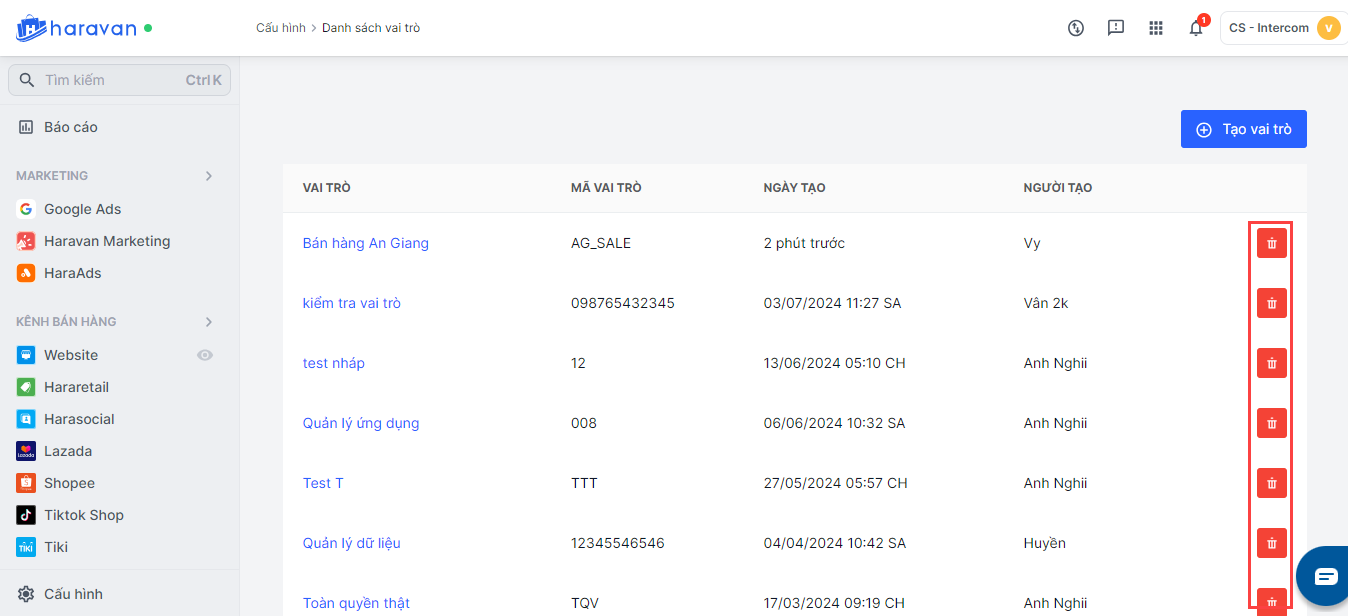 **Bước 1:**Tại trang quản trị MyHaravan, bạn chọn Cấu hình và chọn Nhóm vai trò. Bấm vào biểu tượng xoá màu đỏ ở phía bên tay phải của nhóm vai trò bạn cần xoá.