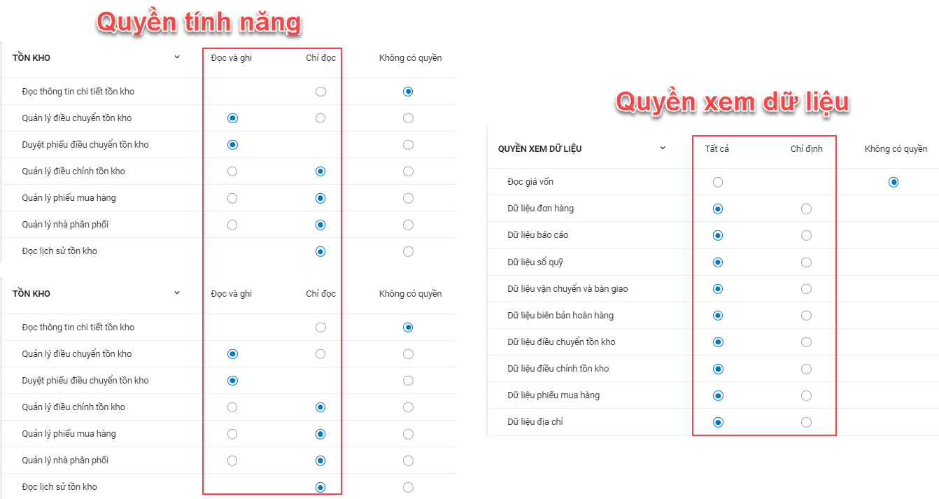 - Tồn kho: Cấp quyền thực hiện các nghiệp vụ quản lý tồn kho.