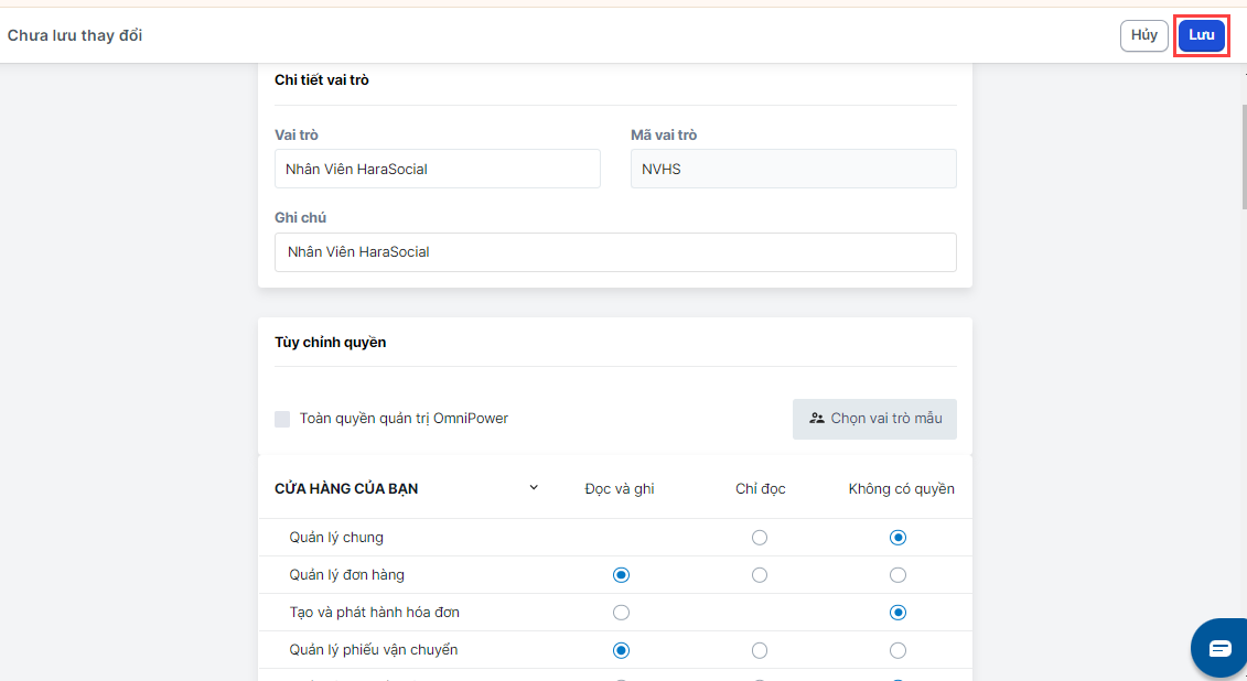 Bước 5:Nếumuốn tuỳ chỉnh các quyền theo nhu cầu riêng của doanh nghiệp, hãy bấm bỏ chọn toàn quyền quản trị OmniPower, sau đó, bạn chọn các loại quyền trong danh sách quyền Haravan cung cấp.