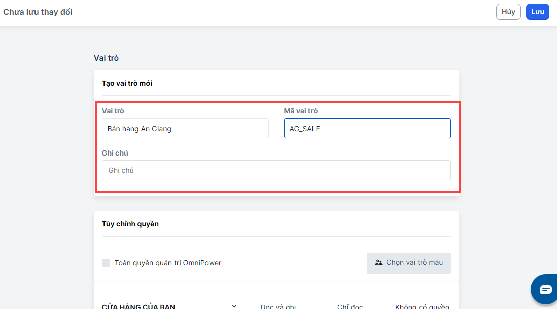 **Bước 2:**Chỉnh sửa Tên, Ghi chú hoặc thêm bớt các quyền cho nhóm vai trò -> Chọn Lưu để hoàn tất.