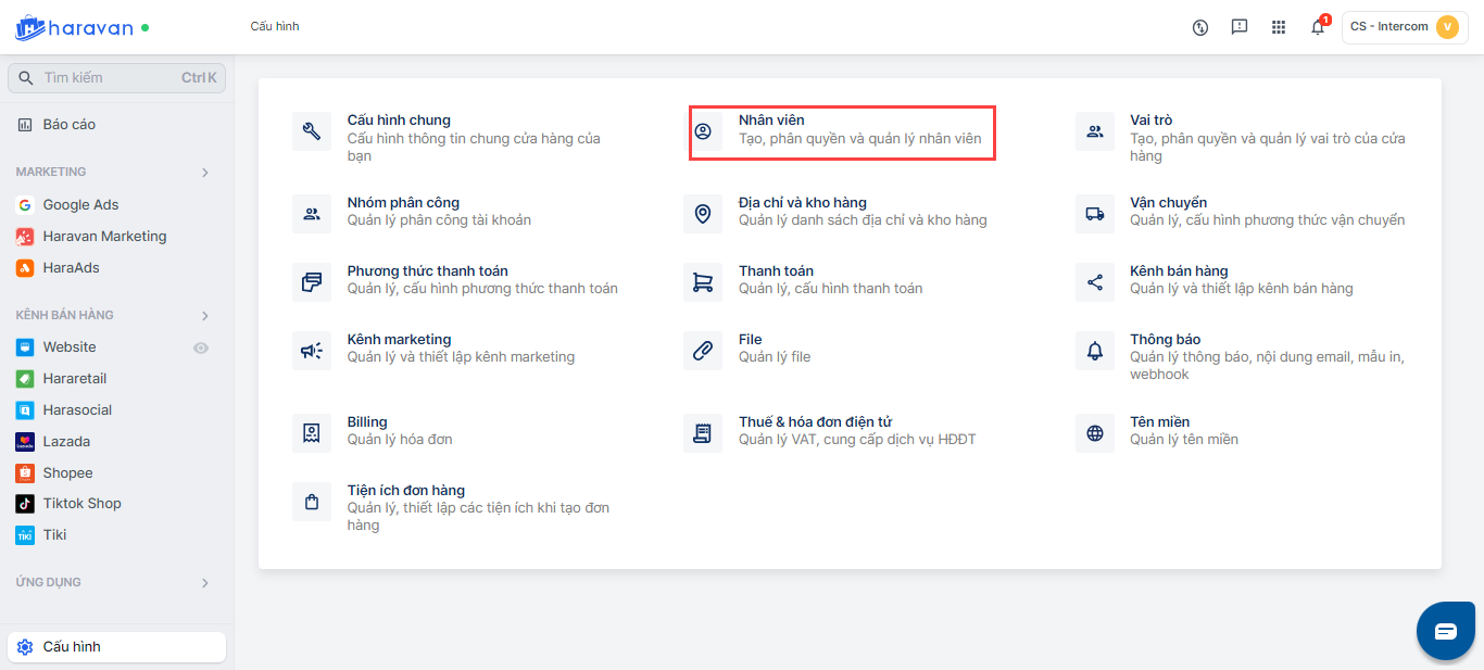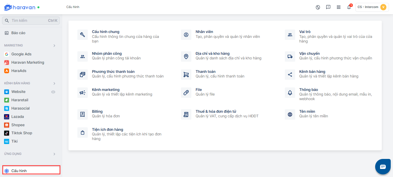 **Bước 1:**Bạn phải đăng nhập vào **Haravan,**chọn Cấu hình.