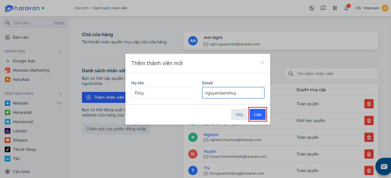 **Bước 4:**Nhập Họ & Tên, Emailcủa nhân viên bạn muốn thêm vào hệ thống, sau đó bấm Lưu.